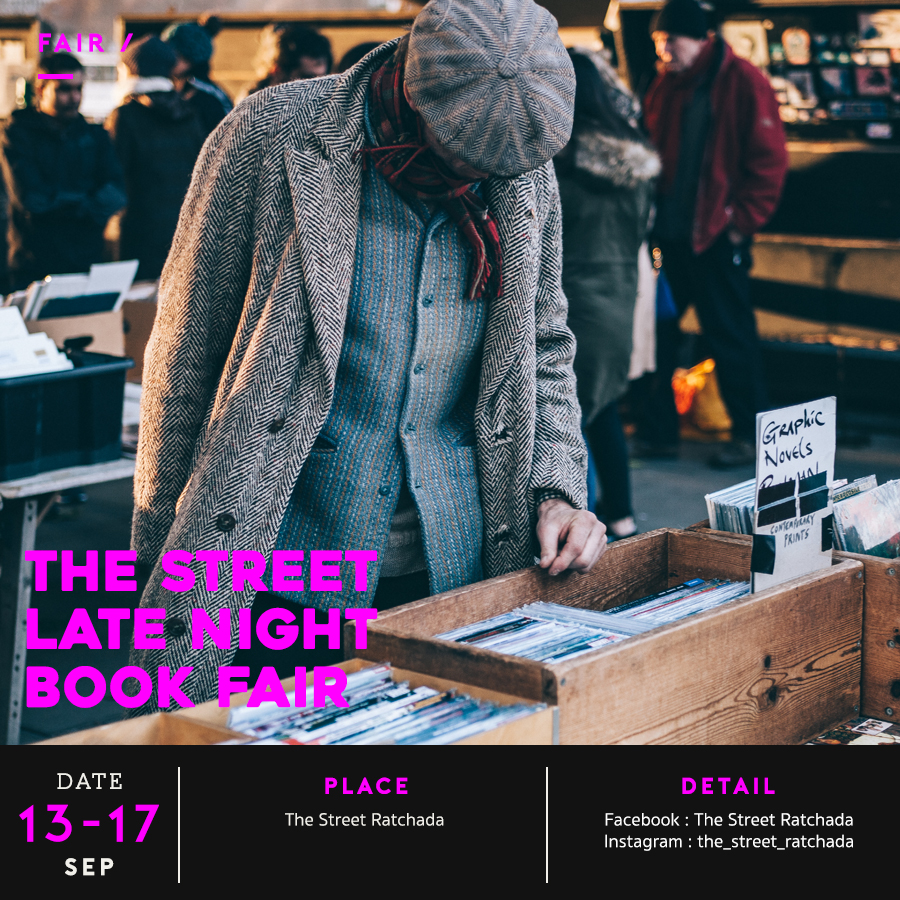 ครั้งแรกกับเทศกาลหนังสือสำหรับคนนอนดึก The Street Late Night Book Fair พาเหรดกิจกรรมเวิร์กช็อปมากมาย พูดคุยกับนักเขียนคนโปรด เอาใจคนรักหนังสือกับส่วนลดพิเศษจากหลายสำนักพิมพ์ชื่อดังอาทิ happening, a book, open worlds, open book, PTK, fullstop, อมรินทร์, เคล็ดไทย, ตอนต่อไป, 10 มิลลิเมตร และอีกมากมาย