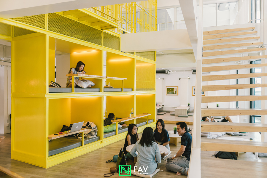 ความพิเศษของ NapLab คือการเป็น co-napping workspace ที่ผสมผสานระหว่าง co-working space กับ hostel จนได้พื้นที่ทำงานที่ ‘งีบหลับ’ ได้ “ที่นี่จะนอนได้ แอบงีบได้ แต่ไม่ถึงขนาดนอนสบายเหมือนเป็นอพาร์ทเม้นท์ อย่างเวลาที่ต้องอ่านหนังสือทั้งคืนแล้ว คุณใช้เวลาแอบงีบ 3-4 ชั่วโมงก็ทำให้คุณสดชื่นขึ้นมาได้ แล้วคุณก็พร้อมที่จะไปสอบหรือไปเรียนต่อตอนเช้าได้เลย”