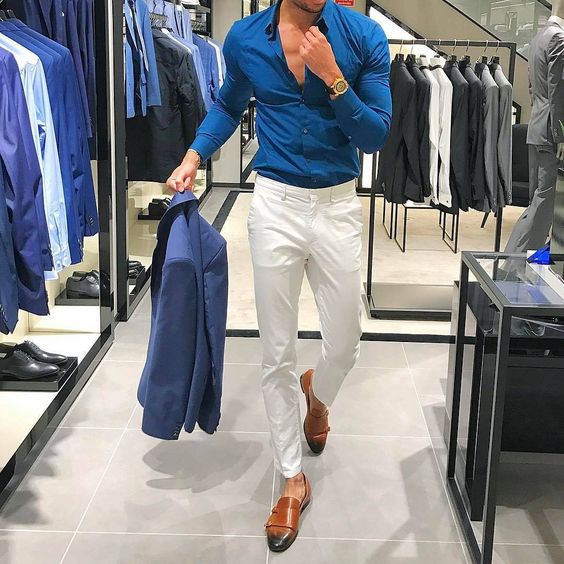 กางเกงสีขาวน่าจะพบได้ในการแต่งตัวลุคนี้มากที่สุด เพราะจะได้ลุคที่สะอาดสะอ้าน ดูเป็นหนุ่มสุภาพ เรียบหรู จะหยิบกางเกงชิโนหรือสแล็คมาใส่คู่กับเสื้อเชิ๊ต ผูกไทด์ ในโทนสีน้ำเงิน สีกรมท่า หรือสีเทา ยิ่งจะช่วยให้หนุ่มๆ ดูช่วงขายาวและโดดเด่นมากขึ้น ใส่เข้าคู่กับรองเท้าหนังสไตล์ Oxfords สีน้ำตาล คอมพลีทลุคที่เป็นทางการได้เลยทีเดียว
