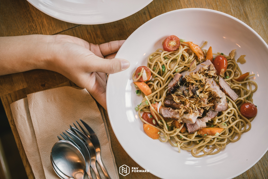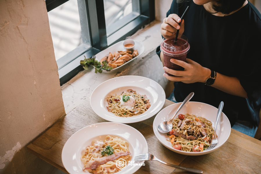 ไม่ว่าจะเป็น “Carbonara” (115 บาท) คาโบนาร่ารสกลมกล่อมที่เสิร์พร้อมเบคอนทอดชิ้นโต ส่วนใครอยากทานรสจัดหน่อย แนะนำให้สั่ง “Dried Chilli Bacon” (145 บาท) สปาเกตตี้ผัดพริกแห้ง เติมความอร่อยด้วยเบคอนและไข่ลวก หรือจะลอง “Yakisoba Pork” (150 บาท) สปาเกตตี้สไตล์ญี่ปุ่น เพราะเป็นสปาเก็ตตี้ยากิโชบะหมูย่าง อีกหนึ่งเมนูขายดีของร้าน “Chicken Wings” (85 บาท) ให้เราสั่งมาแชร์กับเพื่อนๆ ระหว่างรออาหารจานหลัก