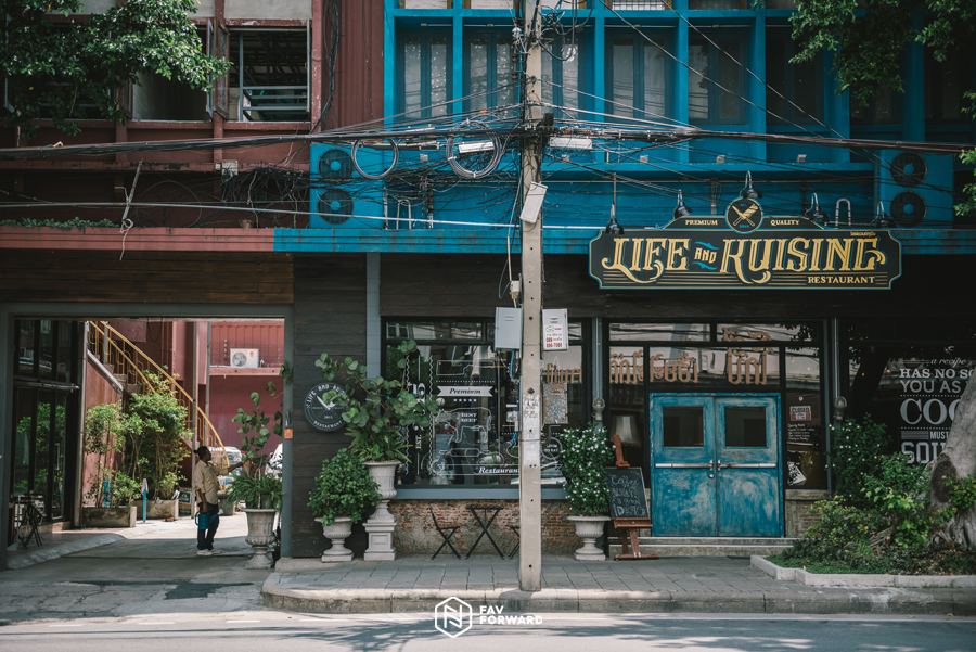 เดินสำรวจชุมชนป้อมมหากาฬเป็นที่เรียบร้อย เดินย้อนกลับทางเดิม โดยลัดเลาะผ่านถนนพระสุเมรุมาเรื่อยๆ จะพบกับคาเฟ่เท่ๆ สไตล์ลอฟท์ในชื่อ “Boo Bike” ให้เราหลบร้อนและเติมพลังก่อนไปลุยกันต่อ สำหรับ Boo Bike เป็นสถานที่ที่เราไม่ได้ตั้งใจมาเยือน เพียงแต่ระหว่างทางถูกดึงดูดด้วยกลิ่นกาแฟหอมๆ จนต้องหยุดแวะก่อนถึงจุดหมายต่อไป