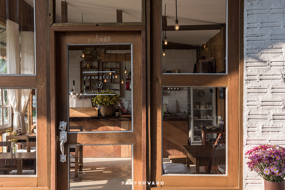หลังจากเช็คอิน ณ จุดสูงสุดแดนสยามและขับรถเรื่อยลงมาจนถึงกิ่วแม่ปาน ใจจริงแค่อยากลงไปทักทายถ่ายรูปชิคๆ แบบฮิปสเตอร์แต่กลายเป็นการเดินทางไกลในป่า ขึ้นเขาลงห้วยกันมากกว่า 3 ชั่วโมง กับไกด์ท้องถิ่นใจดี (พี่ด้า) ชายไซต์มินิที่ใจใหญ่กว่าขนาดตัวหลายเท่า จบการเดินทางไกลครั้งแรกบนกิ่วแม่ปานซึ่งนอกจากความสุขที่ได้ร่วมผจญภัยไปกับเพื่อน ยังมาพร้อมความหิวแบบช้างลากและขาดน้ำตาลอย่างถึงที่สุด ฉะนั้นสิ่งแรกที่ลงมาจากดอย ขอเติมน้ำตาลให้ชุ่มชื้นหัวใจสักหน่อยเถอะ และชื่อหนึ่งที่ปิ๊งขึ้นมาในหัว ซึ่งสถานที่ตั้งอยู่ไม่ไกลจากจุดที่เราอยู่นัก นั่นคือ “youngfolk” ร้านกาแฟแสนเรียบง่ายที่ตั้งอยู่ในอำเภอจอมทอง