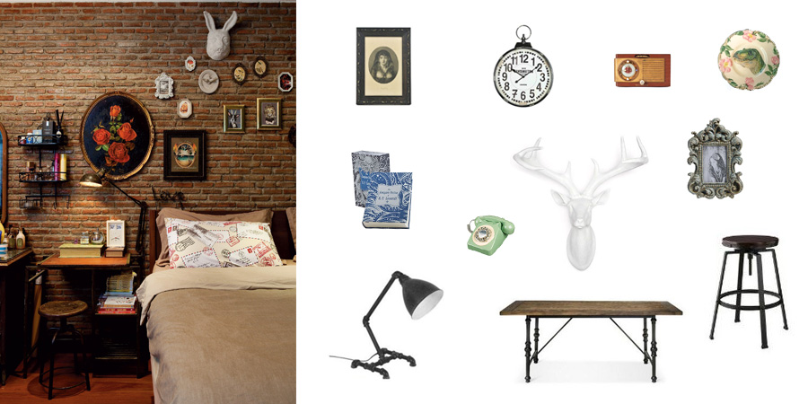 เพิ่มดีเทลให้กับผนังห้องที่ว่างเปล่าด้วยการทำเป็นผนังอิฐมอญแดงแล้วเปลือยพื้นผิวให้ดูดิบ ตกแต่งเพิ่มด้วยเฟอร์นิเจอร์สไตล์ลอฟต์ เช่น โต๊ะไม้โครงเหล็ก เก้าอี้สตูลไม้ขาเหล็ก หัวสัตว์จำลองติดผนังที่ทำจากปูน ตัดกับกรอบรูปที่มีความเป็นวินเทจ ก็ช่วยเพิ่มลูกเล่นไม่ให้ดิบจนเกินไปได้เป็นอย่างดี