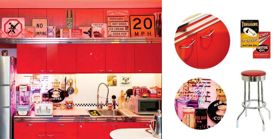 เปลี่ยนผนังห้องครัวเรียบๆแบบเดิม เพิ่มลูกเล่นความเป็น เรโทร เข้าไป เช่น การเลือกใช้กระเบื้องสีดำตัดสลับเป็นลายตารางหมากฮอส เสริมความเด่นชัดด้วยการเลือกใช้ตู้เก็บอุปกรณ์ทำครัวที่มีดีไซน์ เรโทร เก้าอี้สตูลทรงสูงแบบในหนังยุคก่อน และแผ่นป้ายอลูมิเนียมที่มาวางประกอบเป็นพร้อบ ก็ช่วยเพิ่มสีสันได้เป็นอย่างดี