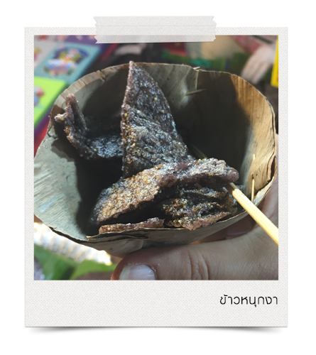 ลองหลับตาและนึกถึงขนมจาก ของขึ้นชื่อเมืองเพชรบุรี เแวบแรกที่เราเห็นข้าวหนุกงา พาให้นึกถึงสิ่งนั้น แต่ด้วยชื่อผนวกกับไม่ใช่คนพื้นเมือง จึงนึกไม่ออกว่าแป้งสีน้ำตาลเทาตรงหน้านั้นจะแปรสภาพออกมาอย่างไร เงยหน้าไปเห็นราคาย่อมเยาแค่ 15 บาท เลยรีบสั่งทันใด ข้าวหนุกงาแท้จริงคือข้าวคลุกงา ใช้งาขี้ม่อน (งาเม็ดกลมสีน้ำตาลเทา) โขลกกับเกลือ และข้าวนึ่งสุกใหม่ๆ ชาวล้านนานิยมทำข้าวหนุกงา ในช่วงฤดูหนาวเฉพาะในช่วงเช้า ซึ่งช่วงนั้นเป็นฤดูกาลเก็บเกี่ยวข้าวใหม่ สามารถหาทานได้ที่ถนนคนเดินท่าแพวันอาทิตย์จ้า