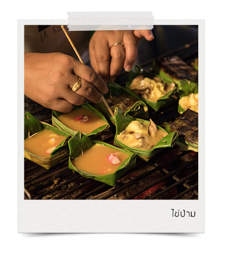 หอมละมุนกลิ่นไข่อาหารพื้นเมืองเชียงใหม่ที่สะดุดตาทั้งภาพและกลิ่น ใบตอง 2-3 ใบวางเรียงรายอยู่บนเตา เราเฝ้าสงสัยว่าอะไรอยุ่ในนั้น เงยหน้าขึ้นไปเห็นป้ายว่า “ไข่ป่าม” แค่ชื่อก็แปลก หน้าตาก็ไม่เคยเห็น จัดแจงสั่งมาชิมทุกไส้ ไม่ว่าจะเป็นหน้าไข่ผึ้ง ไข่มดแดง ปูอัด เห็ดหอม และปลาหมึก คำว่า “ป่าม” เป็นคำเรียกลักษณะการทำอาหารที่ไม่ใช้น้ำมัน แต่จะนำวัตถุดิบสำหรับทำอาหารที่เป็นของเหลวใส่ในกระทงใบตองหรือห่อด้วยใบตอง แล้วนำไปย่างด้วยไฟอ่อนมากๆ จนสุก หาทานได้ที่ถนนคนเดินวัวลายในทุกๆ วันเสาร์