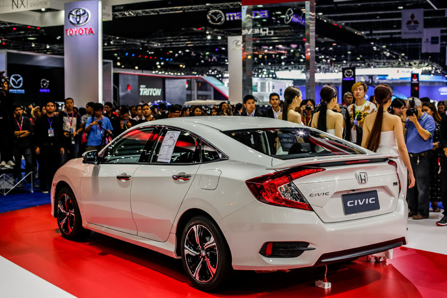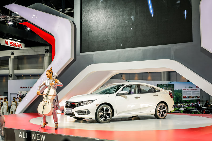 ทางค่าย Honda ถึงแม้จะเพิ่งจัดงานเปิดตัว All-New Civic ไปหมาดๆ แต่ก็ยังขอชู All-New Civic เป็นตัวเด่นสุดในงานครั้งนี้ โดยจัดแสดงผ่านคอนเซป “Road Through The Tunnel of Time เส้นทางแห่งความท้าทาย ผ่านมิติของกาลเวลาสู่ที่สุดแห่งโลกยนตรกรรม” โดยเปิดมุมมองบูธทุกด้านและมีเส้นสีแดงทอดยาวผ่านกลางบูธ เป็นจุดนำสายตาไปยังอุโมงค์รูปตัว C ที่เป็นสัญลักษณ์ของ Honda Civic
