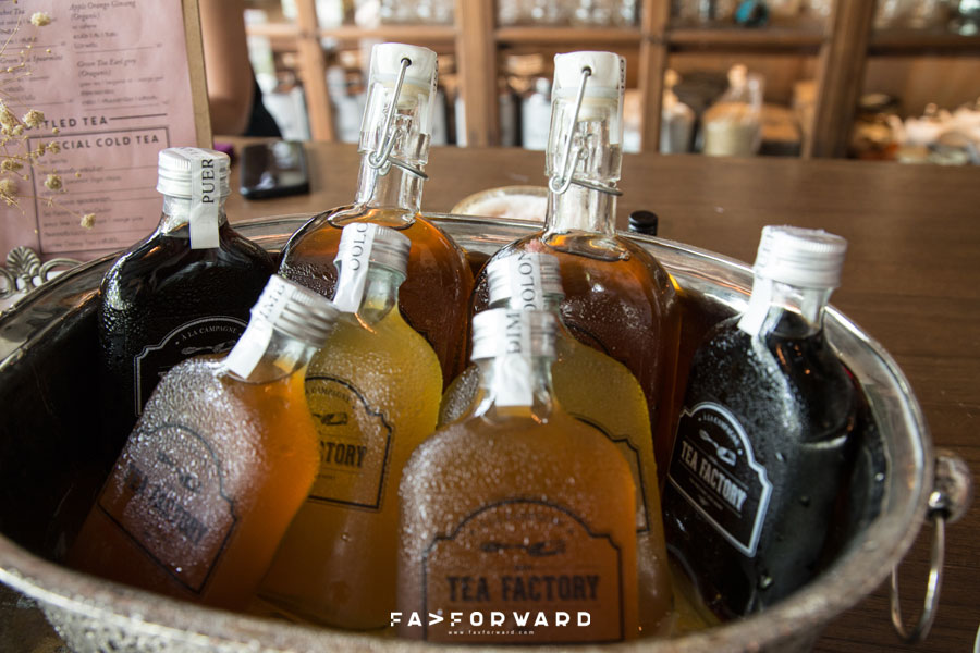 ส่วนใครที่ไม่นิยมดื่มชาร้อน Tea Factory and More ยังมีชาสกัดเย็นเสิร์ฟอีกด้วย ซึ่งเราก็ได้ลิ้มลองชาเฮ้าส์เบลนด์สูตรเฉพาะของร้านอย่าง La Vie En Rose ชากุหลาบสกัดเย็น ซึ่งเป็นชาเบลนด์ระหว่างชาดาร์จีลิ่ง (Darjeeling Tea) เข้ากับดอกกุหลาบ เสิร์ฟในขวดแก้วเก๋ไก๋ นอกจากนี้เรายังได้ลองดื่ม Oolong 10,000 Miles ชาอู่หลงซึ่งนำมาเบลนด์กับดอกหอมหมื่นลี่และตะไคร้จนได้ชารสนุ่มลิ้นและชุ่มคอ และหากใครอยากดื่มชาไร้คาเฟอีน ที่นี่ก็มีชาสมุนไพร ซึ่งเป็นชาไม่มีคาเฟอีนเสิร์ฟอีกด้วย เช่น ชาเกสรดอกบัว ชาดอกไม้ ชา Rooibos จากแอฟริกาใต้ และชาสมุนไพรสดที่ทางร้านปลูกเองในสวนหลังร้าน ฯลฯ