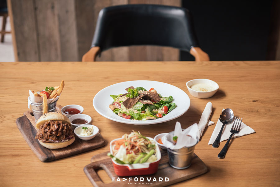หากชอบทานเบอร์เกอร์ขอแนะนำ Vegan Pulled Pork BBQ (310 บาท) เบอร์เกอร์หมูที่เสิร์ฟพร้อมเฟรนฟรายและซอส Vegan สามรสชาติสูตรเฉพาะของร้าน โดยตัวเบอร์เกอร์นี้แม้จะอัดแน่นไปด้วยเนื้อหมูชิ้นโต แต่แท้จริงแล้วเนื้อหมูที่เห็นก็คือเห็ดที่ทางร้านหมักและทำการย่างจนได้รสชาติกลมกล่อมนั่นเอง