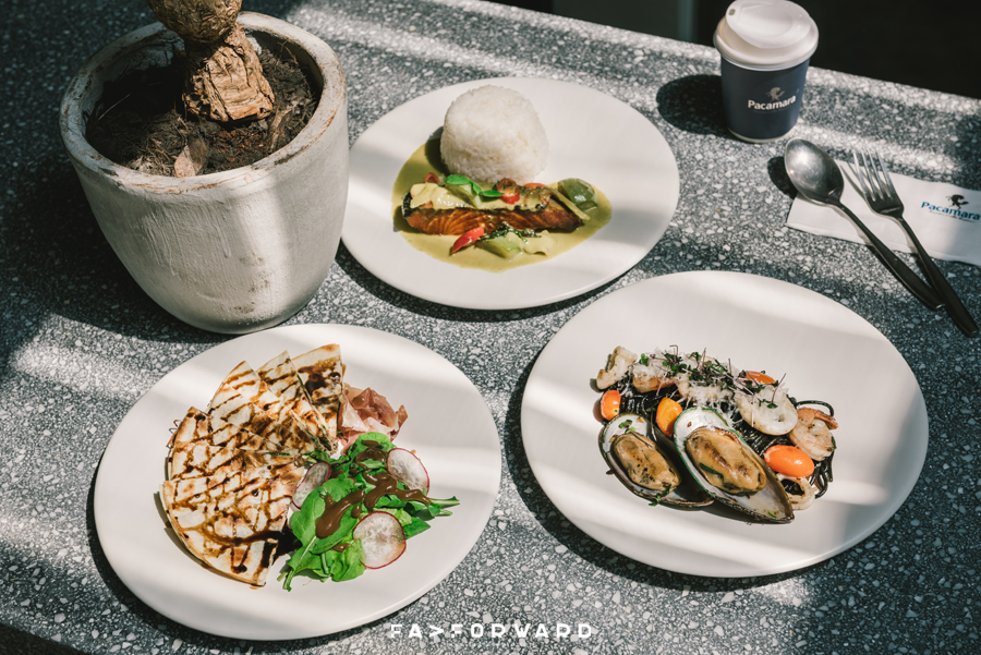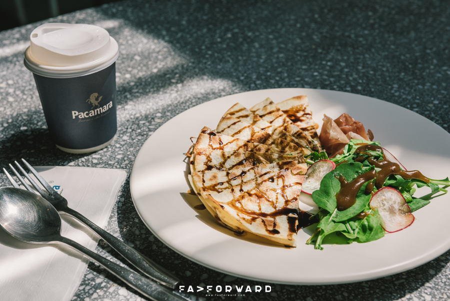 อีกหนึ่งความพิเศษของ Pacamara Coffee Roasters X Speciatyl Coffee Lab คือที่นี่มีอาหารและขนมหวานเสิร์ฟให้เราได้อิ่มท้อง เริ่มจากอาหารฟิวชั่นจานหลักที่ได้เชฟจากโรงแรมดังมารังสรรค์ความอร่อย ไม่ว่าจะเป็น Tortilla Serrano Ham (190 บาท) อาหารสเปนที่เชฟลงมือนวดแป้งด้วยตัวเอง แผ่นแป้งที่ได้จึงบางกรอบและหอมกรุ่น นอกจากนี้ข้างในแป้งยังสอดไส้แฮมสไลด์บางเฉียบแต่ได้รสชาติความเป็นแฮม เพิ่มความอร่อยด้วยซอสสูตรเฉพาะของร้าน
