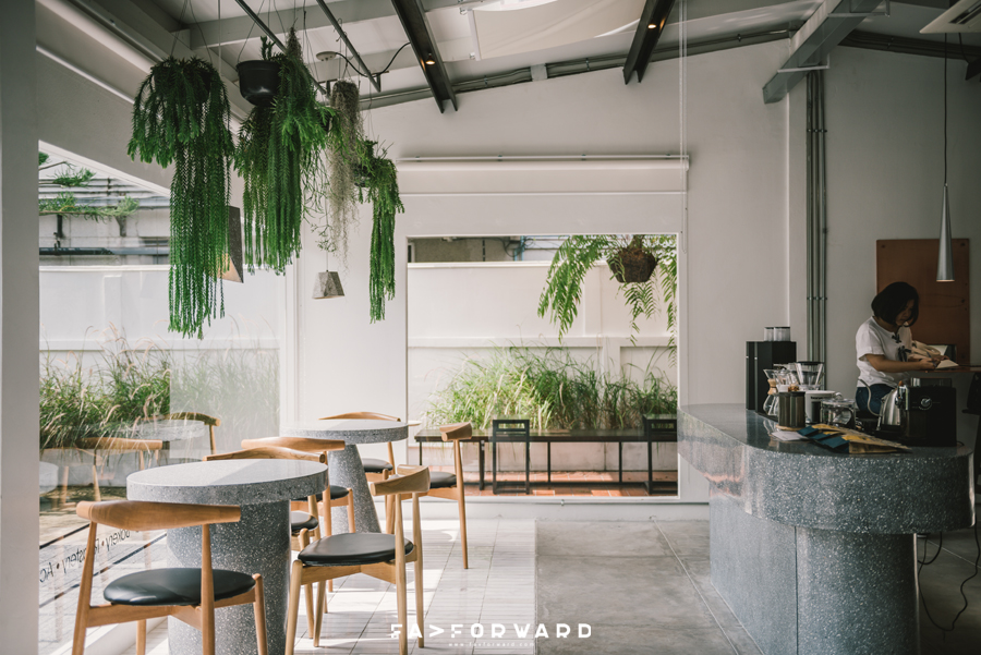 ไม่ว่าจะเป็นพื้นที่ส่วนหน้าของคาเฟ่ที่เลือกใช้โต๊ะหินขัดสีเทา เข้ากันกับเก้าอี้ไม้สีน้ำตาลดำทรงโมเดิร์น เพิ่มความสดชื่นด้วยสีเขียวจากไม้แขวน ทำให้มุมนี้กลายเป็นมุมโปรดของคากาแฟและเป็นมุมโดดเด่นในร้าน โดยตรงกลางคาเฟ่จัดให้เป็นพื้นที่สำหรับการรังสรรค์กาแฟรสอร่อยของเหล่าบาริสต้า