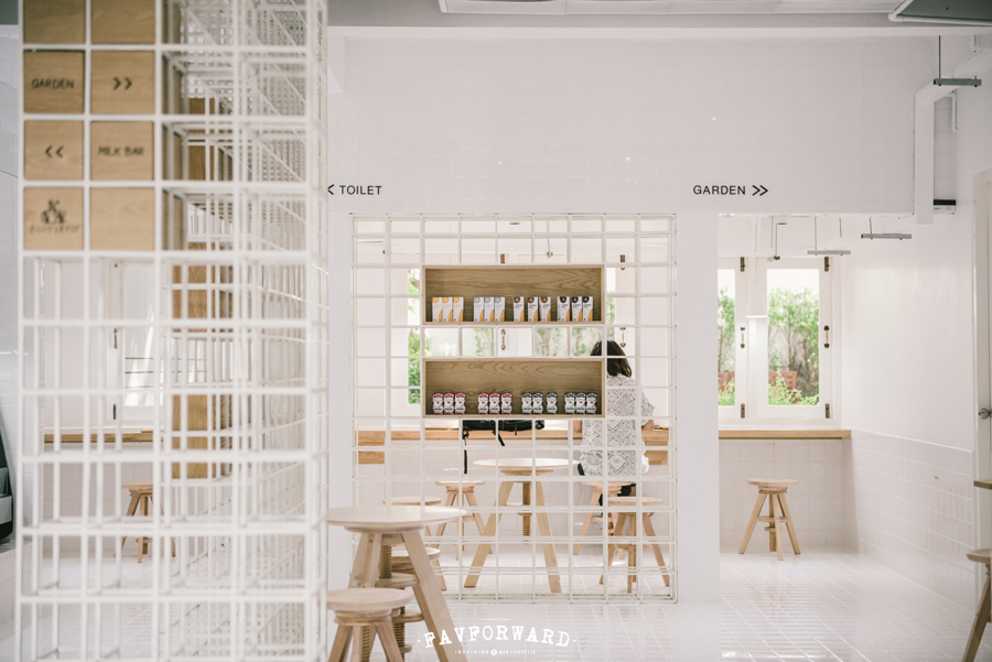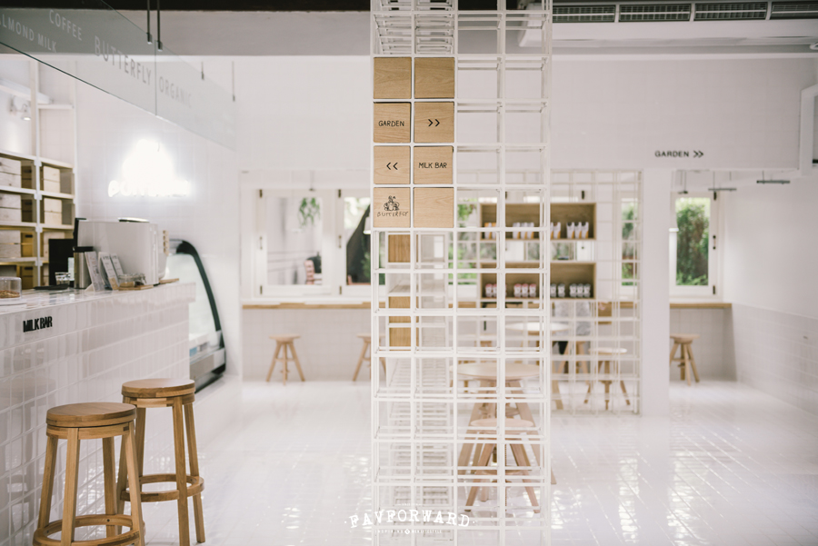 สำหรับคาเฟ่สีขาว Butterfly Organic Place มีคอนเซ็ปต์ว่า “นม” จึงเป็นสีขาวตลอดทั้งร้านเพื่อสื่อถึงนมออแกนิกที่ไม่เจือสารใดๆ ของแบรนด์ ผนวกกับความครีเอทของอินทีเรียที่นำวัสดุธรรมดามาตกแต่งจนได้คาเฟ่สีขาวที่แฝงความเก๋ไก๋เอาไว้ ไม่ว่าจะเป็นกระเบื้องสีขาวสะอาดที่แทรกคำคมเอาไว้ หรือการใช้เหล็กโปร่งสีขาวเพื่อเพิ่มดีเทลให้ร้านมีเอกลักษณ์ยิ่งขึ้น โดยเฉพาะบันไดเวียนหินอ่อนที่ชวนสะดุดตาตั้งแต่เดินเข้าร้าน เพิ่มความอบอุ่นด้วยเฟอร์นิเจอร์ไม้สีน้ำตาลอ่อนดูสะอาดตา