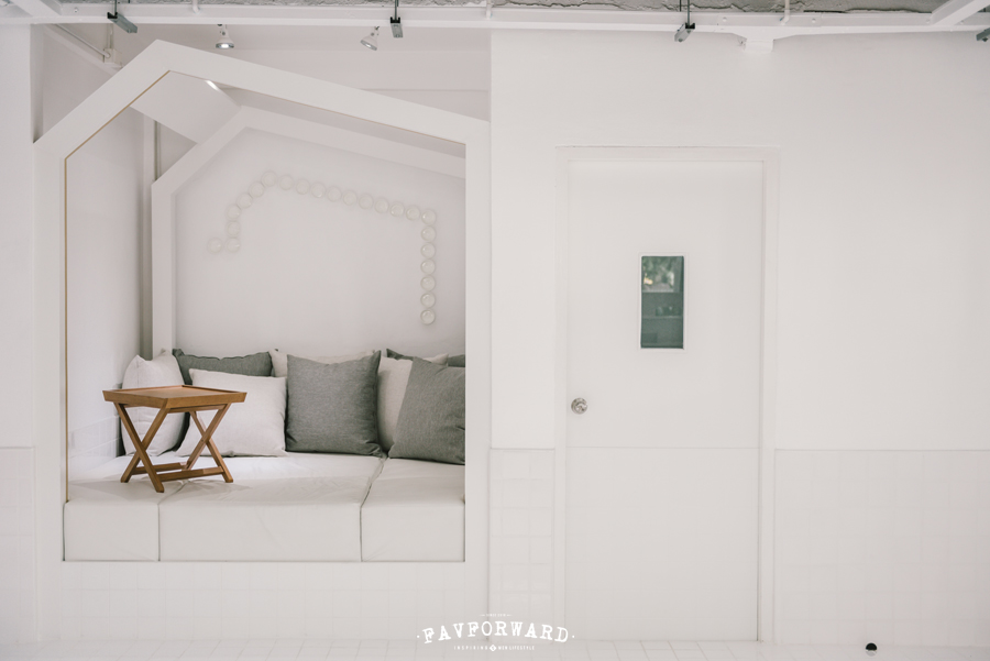 มุมหนึ่งของร้านจัดทำเป็นโซฟารูปบ้านที่ให้เรานั่งเอนหลังดื่มนมอ่านหนังสือ แต่หากใครที่อยากนั่งทำงาน คาเฟ่นมแห่งนี้ก็ออกแบบพื้นที่สำหรับนั่งทำงานเอาไว้ด้วย โดยมีสวนหลังร้านเป็นทิวทัศน์ นอกจากนี้ Butterfly Organic Place ยังมีพื้นที่ Meeting Room ไว้บริการสำหรับลูกค้าที่ไปเป็นแก๊งไว้บริการอีกด้วย