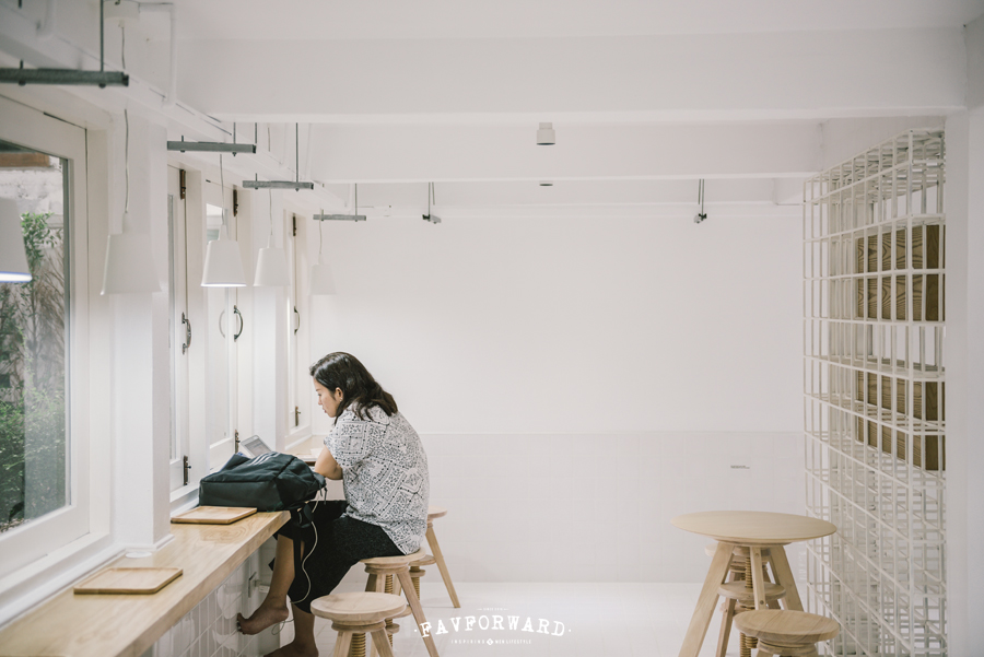 และเมื่อกิจการเริ่มขยายตัวจนต้องหาออฟฟิศใหม่ คุณแอร์จึงตัดสินใจทำคาเฟ่กึ่งออฟฟิศในย่านทองหล่อ โดยเนรมิตชั้นล่างของสตูดิโอเก่าให้เป็นคาเฟ่สีขาวสะอาดตา ส่วนชั้นบนก็เป็นออฟฟิศของแบรนด์ Butterfly Organic Milk