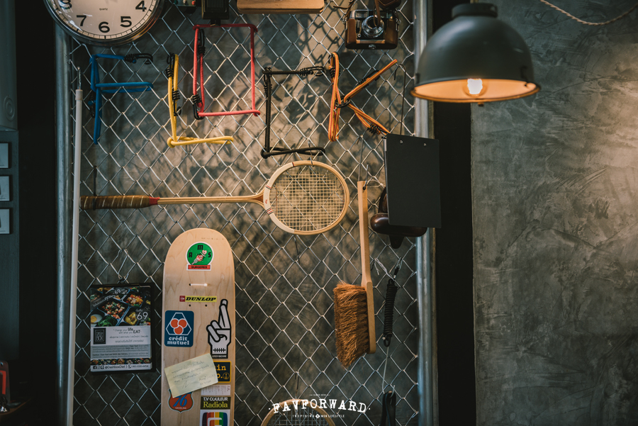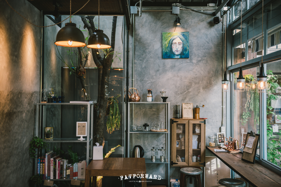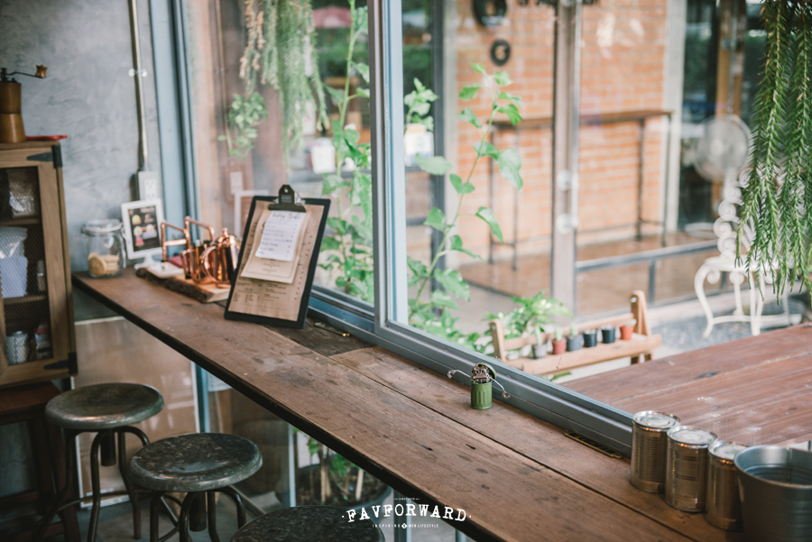 และจากความสนุกที่ได้ออกแบบร้านและแต่งร้านด้วยตัวเอง โดยเฉพาะการได้นำสิ่งที่ชอบมารวมกัน ทั้งงานอิฐ งานไม้ และเหล็ก ทำให้คาเฟ่แห่งนี้มีคอนเซ็ปต์ว่า ‘อินดัสเทรียลลอฟต์’ ด้วยการแต่งร้านดิบๆ ทั้งการใช้ผนังปูนเปลือย โครงเหล็กเท่ๆ และเฟอร์นิเจอร์ไม้เก๋าๆ ผนวกกับของสะสมแสนเก๋ที่เสมือนยกบ้านมาไว้ที่นี่ ทำให้คาเฟ่ที่มีพื้นที่จำกัดแห่งนี้กลายเป็นคาเฟ่เท่ๆ สไตล์อินดัสเทรียลลอฟต์อย่างลงตัว ภายในร้านยังกั้นกระจกใสล้อมต้นไม้ใหญ่ ซึ่งเป็นต้นไม้ที่มีอยู่เดิมก่อนที่คุณน้ำจะทำการปรับปรุงพื้นที่ จึงช่วยลดความดิบของร้านลง ขณะเดียวกันก็เสริมให้ร้านมีบรรยากาศสดชื่น