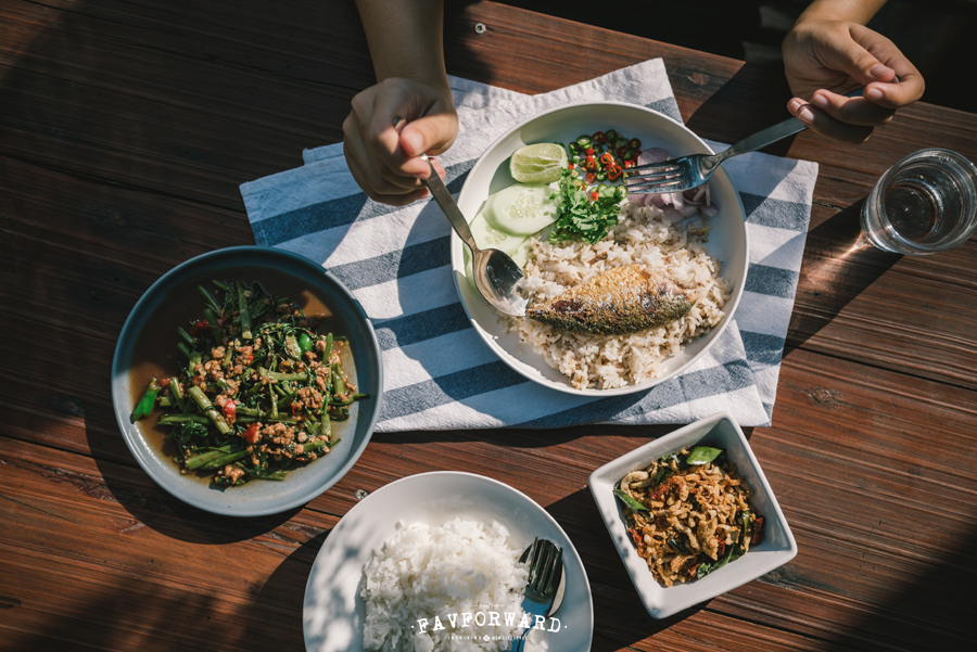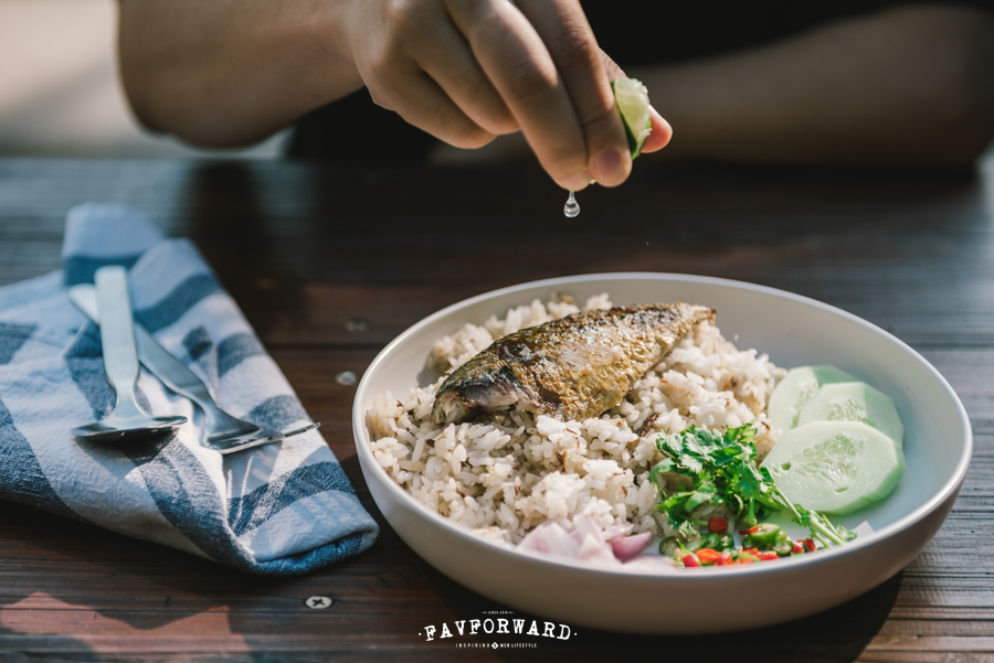 อีกเมนูซิกเนเจอร์ที่มีชื่อชวนสงสัย “ข้าวแมว” ซึ่งเป็นข้าวคลุกปลาทู เสิร์ฟพร้อมปลาทูเป็นตัวๆ และผักเป็นเครื่องเคียง โดยคุณน้ำเล่าให้ฟังถึงที่มาของเมนูและชื่อเมนูที่แสนแปลกนี้ว่า “อันนี้ชอบส่วนตัว แล้วก็เรียกเอง สมัยก่อนคนชอบคิดกันว่าแมวชอบปลาทู ก็เลยเอาข้าวไปคลุกปลาทู เราก็เรียกว่าข้าวแมว”