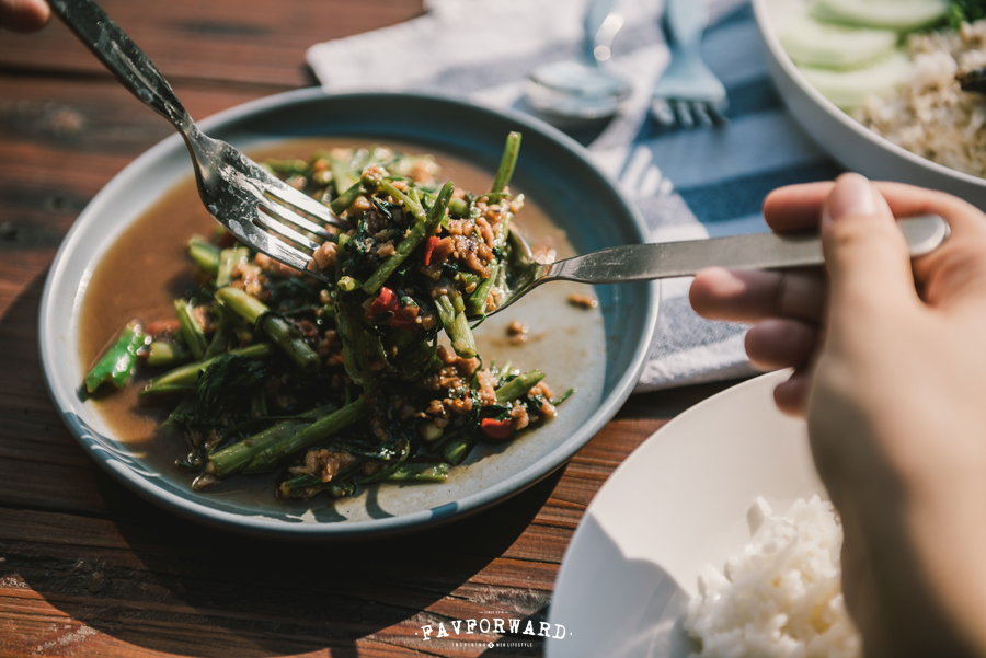 และด้วยระยะเวลา 2 เดือนในการเปลี่ยนพื้นที่ว่างให้กลายเป็นคาเฟ่เท่ๆ ก็คือช่วงเวลาที่คุณน้ำได้สนุกกับการครีเอทรสชาติใหม่ๆ แบบไม่ซ้ำใครและเป็นเมนูที่หาทานที่อื่นไม่ได้ ทั้งอาหารคาวและขนมหวาน เริ่มจาก “ผักบุ้งผัดกะปิ” เมนูผัดผักบุ้งที่คุ้นเคย แต่รสชาติไม่คุ้นเคยแน่นอน เมื่อคุณน้ำเพิ่มความอร่อยให้เมนูนี้ด้วย ‘กะปิ’ คุณภาพดีที่ส่งตรงจากใต้ กลายเป็นเมนูผักบุ้งผัดกะปิรสอร่อยจนต้องยกนิ้วให้