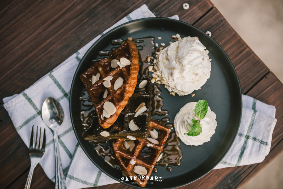 ความพิเศษของขนมหวานเมนูนี้ คุณน้ำเล่าว่า “เรารู้สึกว่าเราเปิดร้านข้าวคู่กับขนม ดังนั้นวาฟเฟิลไม่ควรจะอิ่มมากหลังจากที่กินข้าว เราก็เลยทำให้เล็กลง กรอบขึ้น นุ่มข้างในนิดนึง พวกซอสคาราเมล เราคิดว่าซื้อสำเร็จรูปมันก็อร่อยนะแต่ไม่หอม ก็เลยทำเองดีกว่า ใช้ช็อกโกแลตดีหน่อย เคี่ยวน้ำตาลเอง รู้สึกว่ามันโฮมเมดจริงๆ แล้วก็ได้รสอย่างที่ต้องการ”
