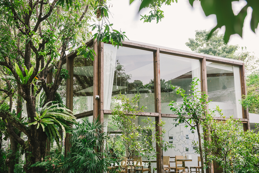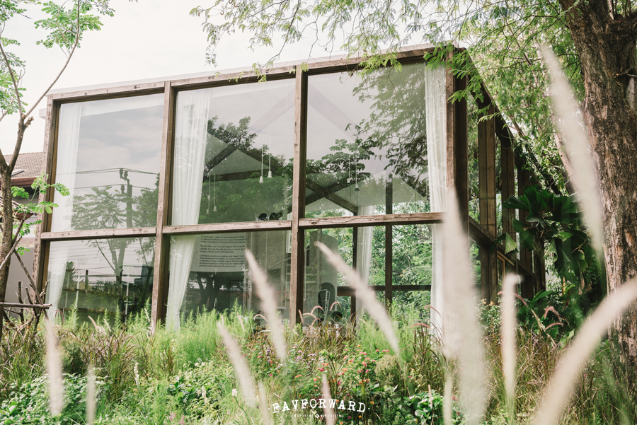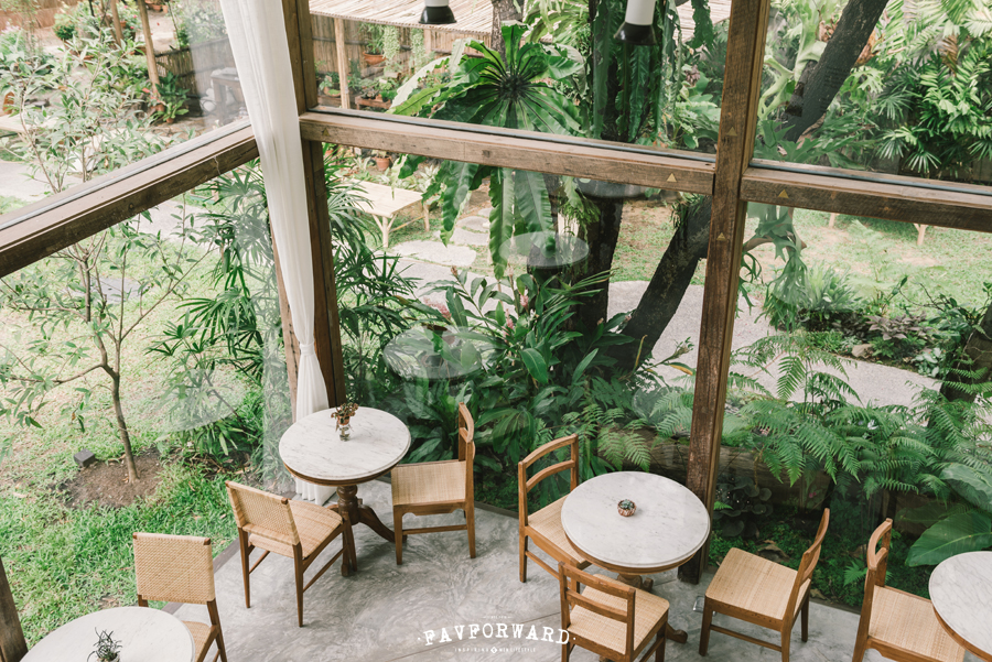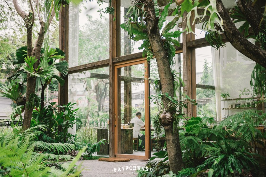 โดยคุณฟี่เปลี่ยนที่ดินเปล่าให้กลายเป็นคาเฟ่เรือนกระจกที่รายล้อมด้วยธรรมชาติ ทั้งจากไม้ประดับนานาชนิดและต้นไม้ใหญ่ที่ให้ร่มเงา เพิ่มความเท่อย่างมีเอกลักษณ์ด้วยการใช้ไม้เก่าอายุกว่า 40 ปีจากสวนสามพรานมาทำโครงสร้าง และเมื่อเราถามถึงแรงบันดาลใจของการแต่งร้าน คุณฟี่ก็เล่าว่า