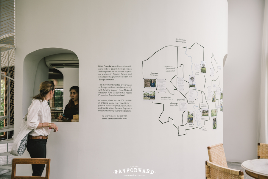หัวใจสำคัญของการเป็นคาเฟ่ออร์แกนิกของ Patom อยู่ที่ลูกค้าทุกคนสามารถรับรู้ถึงแหล่งที่มาของวัตถุดิบทุกตัวที่จำหน่ายในคาเฟ่แห่งนี้ โดยคุณฟี่ใช้พื้นที่ผนังของร้านวาดแผนที่เพื่อแสดงให้ลูกค้าได้เห็นกลุ่มเกษตรกรออร์แกนิกที่นำผลผลิตมาจำหน่ายในร้าน โดยคุณฟี่แบ่งพื้นที่ออกเป็นสองส่วนด้วยกัน ส่วนหนึ่งกันเป็นโต๊ะเก้าอี้ไว้บริการลูกค้า ส่วนด้านหนึ่งจัดวางผลิตภัณฑ์ออร์แกนิกของแบรนด์ Patom เสริมลูกเล่นให้น่าสนใจด้วยเครื่องกลั่นกุหลาบมอญที่วางโชว์ให้เราได้เห็นกันชัดๆ ซึ่งกุหลาบมอญถือได้ว่าเป็นวัตถุดิบพิเศษของที่นี่