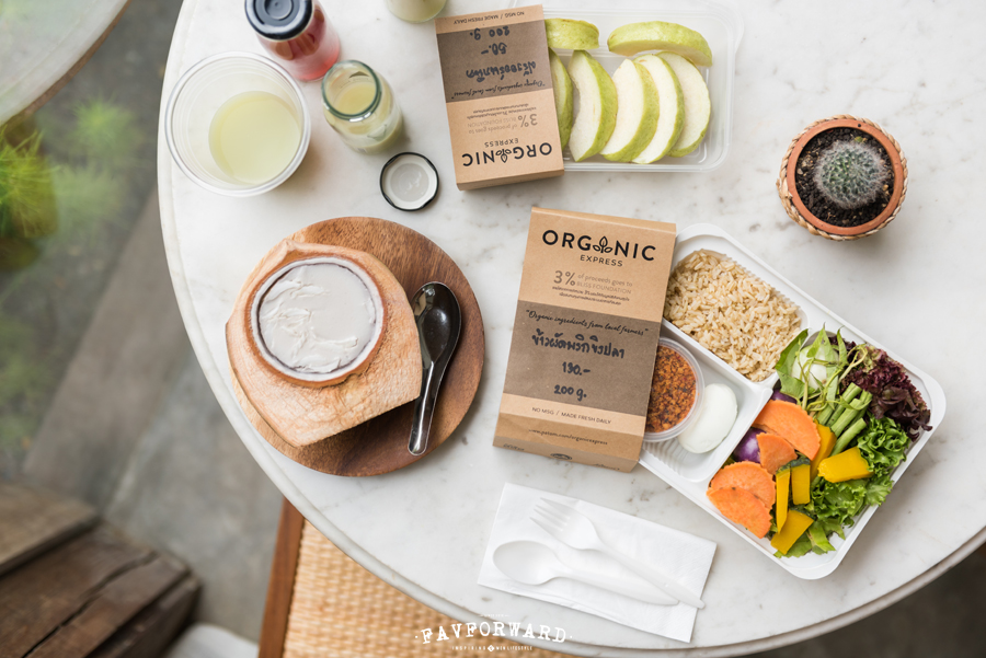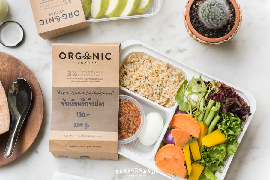 โดยภายในคาเฟ่ Patom แห่งนี้นอกเหนือไปจากผลิตภัณฑ์ออร์แกนิกที่ใช้ในชีวิตประจำวัน อาทิ น้ำยาสระผม สบู่เหลว ยาดม ฯลฯ แล้ว ยังจำหน่ายเครื่องดื่มและอาหารทั้งอาหารจานหลักและขนมไทยโบราณอีกด้วย เริ่มจาก Organic Express ข้าวผัดพริกขิงปลา ที่เกิดจากการนำผลผลิตทางการเกษตรจากมูลนิธิสังคมสุขใจมาปรุงเป็นข้าวกล่อง ภายในข้าวกล่องจะอุดมด้วยผักสดตามฤดู 200 กรัม เสิร์ฟพร้อมข้าวกล้อง ไข่ต้ม และน้ำพริกผัดพริกขิงปลานิล แน่นอนว่าข้าวกล่อง Organic Express ไม่จำกัดเพียงข้าวผัดพริกขิงปลาเท่านั้น แต่ยังมีอีกหลากเมนูให้เลือกชิม อาทิ ไข่พะโล้ ต้นจับฉ่าย ส้มตำ เป็นต้น โดยทุกเมนูล้วนจัดใส่กล่องเพื่อความสะดวกในการซื้อกลับบ้าน หรือคุณจะสั่งมากินในร้านก็ไม่ว่ากัน