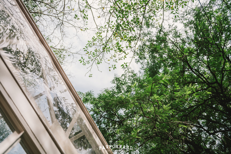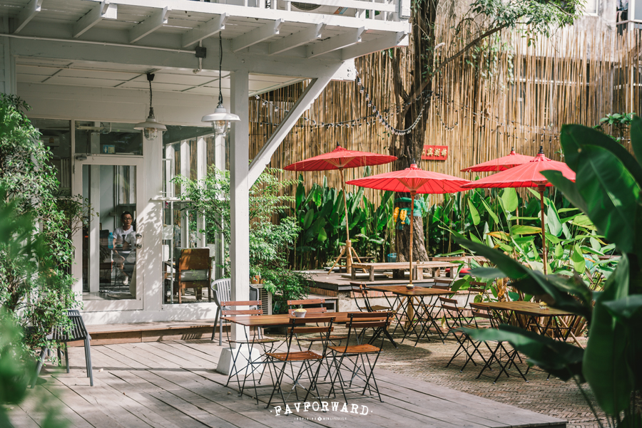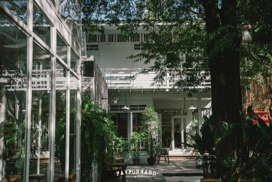 ถัดไปอีกนิดจะเป็น Glass House ที่คุณคามินได้เพิ่มเติมขึ้นมา เพื่อเพิ่มบรรยากาศโมเดิร์นให้ร้านดูร่วมสมัย โดยพื้นที่นี้คุณคามินตั้งใจให้เป็นพื้นที่เสิร์ฟอาหารจานหลัก เพื่อป้องกันไม่ให้กลิ่นอาหารที่อาจจะรบกวนลูกค้าที่นั่งดื่มกาแฟหากเสิร์ฟทั้งอาหารคาวและกาแฟในพื้นที่เดียวกัน แม้จะเป็นอาคารกระจกใสที่เปิดโล่งชวนให้เรารู้สึกร้อน แต่ Glass House กลับร่มรื่นด้วยต้นไม้ใหญ่ที่รายล้อม ผนวกกับผนังอิฐมอญดิบที่ช่วยเพิ่มความโดดเด่นให้ห้องกระจกเรียบๆ แห่งนี้ และแม้ Glass House จะออกแบบในสไตล์โมเดิร์น แต่กลับกลมกลืนกับบรรยากาศคลาสสิกของร้านได้อย่างลงตัว