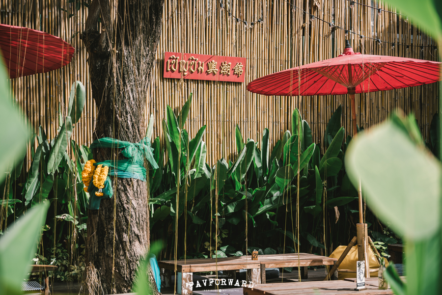 อีกหนึ่งพื้นที่ที่สะดุดตาตั้งแต่ก้าวเข้าสู่พื้นที่ร้านคือ พื้นที่เอ๊าต์ดอร์ที่รายล้อมด้วยไม้ไผ่ที่สูงถึง 8 เมตร ให้เสน่ห์ที่มีเอกลักษณ์และยังชวนให้คิดถึงบรรยากาศเย็นสบายบนพื้นที่แถบภาคเหนืออีกด้วย โดยพื้นที่เอ๊าดอร์นี้คุณคามินเลือกที่จะวางโต๊ะเก้าอี้แบบญี่ปุ่นแทนโต๊ะเก้าอี้แบบสากล และยังเลือกจัดวางแบบห่างๆ เพื่อสร้างความเป็นส่วนตัวและให้บรรยากาศสบายๆ ไม่แออัดอีกด้วย