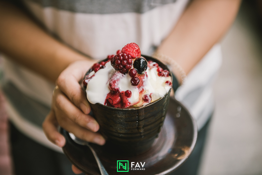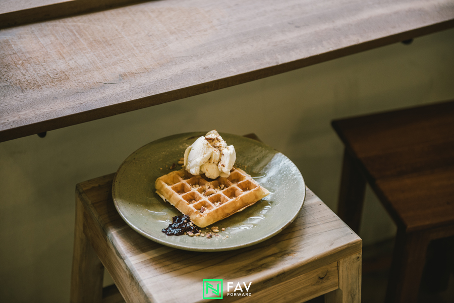 แต่สำหรับสาวๆ ที่อยากได้เครื่องดื่มแก้วสวยเอาไว้ถ่ายรูป ต้องไม่พลาดกับ “Mixed Berries Smothies” (85 บาท) สมูทตี้ในแก้วเซรามิกสีเข้มตัดกับผลเบอร์รี่สีสด เครื่องดื่มแก้วนี้ให้รสชาติเบอร์รี่เข้มข้นเป็นพิเศษ เพราะคุณง้วนนำเบอร์รี่หลากชนิดไปปั่นรวมกันแบบไม่เติมน้ำหรือน้ำแข็ง แล้วจึงนำไปแช่เย็น เพิ่มมิติความอร่อยด้วยโยเกิร์ตเยิ้มๆ ก่อนจะท็อปปิ้งด้วยเบอร์รี่ นอกจากนี้คุณง้วนยังใจดีทำ “Waffle” (120 บาท) วาฟเฟิลยีสต์ที่กรอบนอกแต่ข้างในเหนียวนุ่ม เสิร์ฟพร้อมไอศกรีมและแยมทำเองให้เราได้ลองชิมอีกด้วย
