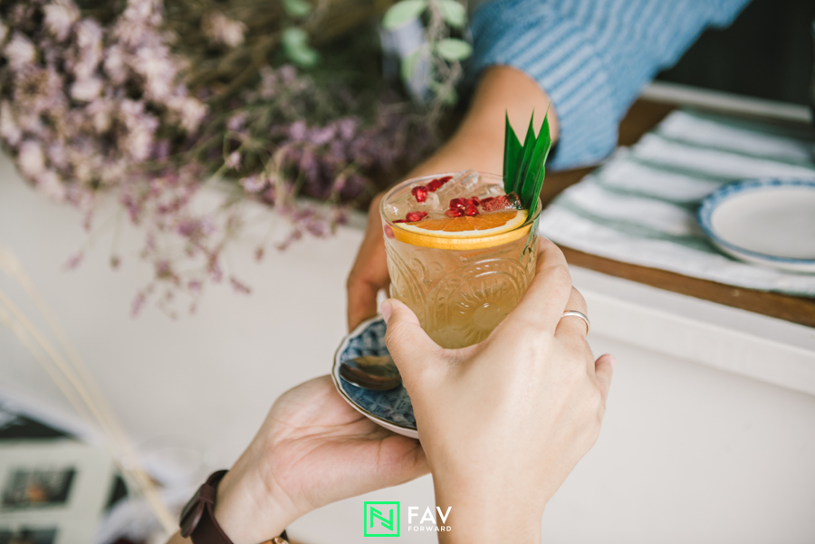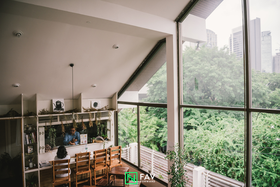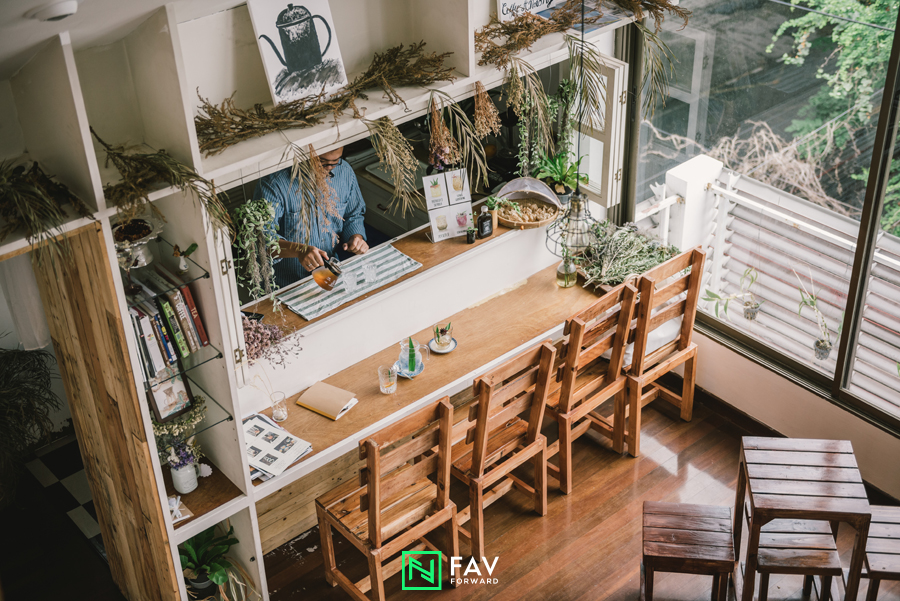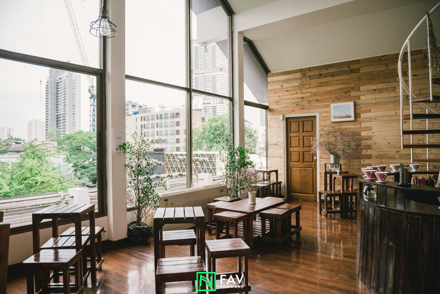 ในส่วนของบรรยากาศนั้น ที่นี่กลับไม่ซับซ้อนเหมือนเครื่องดื่มด้วยบรรยากาศสบายๆ โดยยังคงเสน่ห์ไทยๆ จากการตกแต่งด้วยไม้และดอกไม้แห้ง ชวนให้คิดถึงชานบ้านเรือนไทย โดยมีเคาน์เตอร์ครัวและบาร์ดีไซน์ฆ้องวงเป็นจุดดึงสายตา เพิ่มความผ่อนคลายด้วยทิวทัศน์จากมุมสูงที่รายล้อมด้วยธรรมชาติสีเขียวจากต้นไม้ใหญ่ “เราไม่ได้ตกแต่งอะไรเยอะ เพราะ เราคิดว่าทำที่นี่ให้คนมานั่งพักผ่อนดีกว่า อยากให้มาแล้วรู้สึกมาพักผ่อนมากกว่า มา Take Time อยู่กับตัวเอง คิดงานหรือคิดอะไรบางอย่างในบรรยากาศสงบๆ”