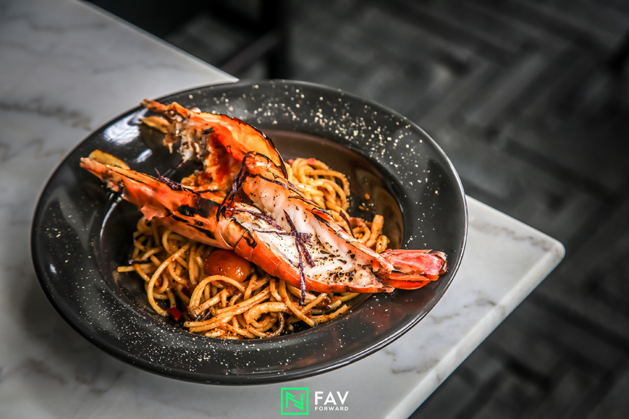 โดยเมนูซิกเนเจอร์ที่คุณโทนี่แนะนำเราในวันนี้ เป็นเมนูที่มีมาตั้งแต่เริ่มแรกซึ่งแสดงให้เห็นถึงรสชาติที่ถูกปากสะกดใจลูกค้าจนต้องเสิร์ฟเมนูนี้เรื่อยๆ อย่าง “Spaghetti Tom Yum with Flame – Grilled River Prawn” (390 บาท) สปาเก็ตตี้ต้มยำที่ให้ทั้งกลิ่นและรสต้มยำแบบเข้มข้น โดดเด่นด้วยกุ้งแม่น้ำเนื้อแน่นตัวโตที่เผาจนได้ที่ เป็นเมนูจานอร่อยที่คนชอบกินสปาเก็ตตี้ห้ามพลาด