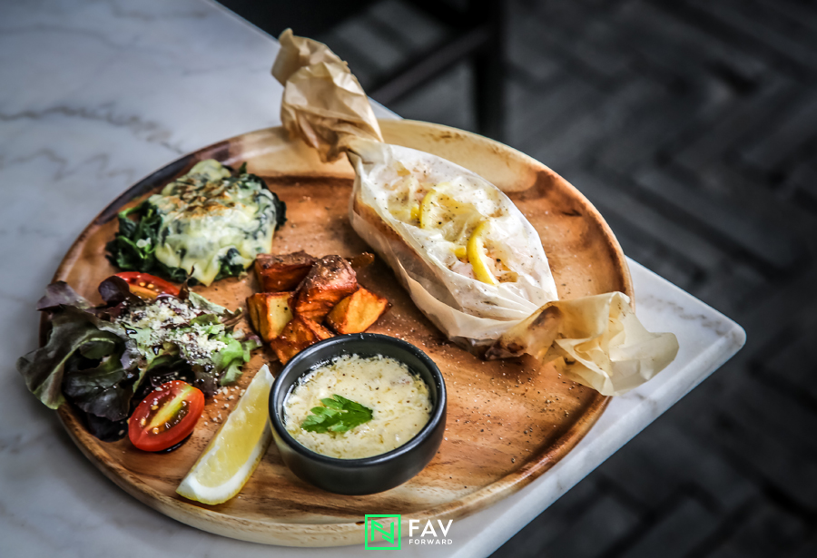 อีกหนึ่งเมนูซิกเนเจอร์ที่อร่อยไม่แพ้กันคือ “Salmon Toffee with Parmesan Spinach and Roasted Potatoes” (360 บาท) แซลมอนนึ่งที่เคล้าด้วยเครื่องต้มยำห่อในกระดาษทรงท๊อฟฟี่ เสิร์ฟพร้อมด้วยผักโขมอบชีส มันฝรั่งทอด และสลัดผัก เพิ่มความอร่อยด้วยซอสที่เข้ากันอย่างลงตัวกับเนื้อปลาแซลมอน