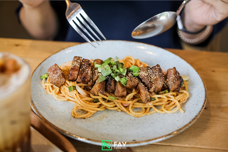 ส่วนอีกหนึ่งเมนูซิกเนเจอร์ “Moo-Nam-Tok Pasta” (190 บาท) เมนูขายดีเรื่อยมาตั้งแต่เปิดคาเฟ่แห่งนี้ โดยเป็นการมิกซ์ความอร่อยระหว่างเมนูตะวันตกกับความอร่อยแบบไทยๆ โดยเฉพาะรสชาติที่ถึงเครื่องของหมูเนื้อนุ่ม โดยทางร้านมีสูตรการหมักเฉพาะจนได้หมูน้ำตกที่กลมกล่อมและเข้มข้น ให้รสเปรี้ยว เผ็ด และหอมเครื่องเทศกำลังดี