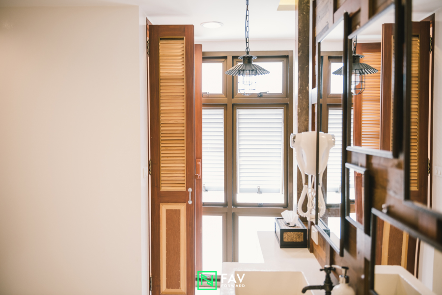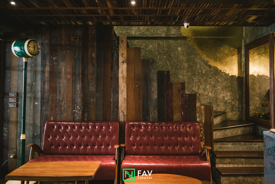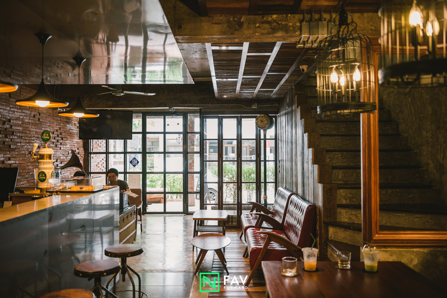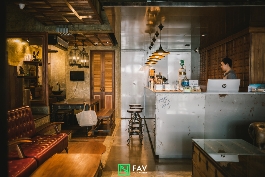 เริ่มจากการเปิดสเปซชั้นหนึ่งให้เป็นทั้ง Reception และ “คาเฟ่” ที่คอยต้อนรับทั้งนักท่องเที่ยวที่เข้าพักและลูกค้าขาจอนอย่างเรา โดยตกแต่งคาเฟ่ในสไตล์ Thai – Industrial Loft ด้วยการแบ่งพื้นที่ด้านหนึ่งให้โดดเด่นด้วยผนังอิฐมอญโชว์แนวสั่งทำพิเศษ จัดวางเฟอร์นิเจอร์และของตกแต่งสไตล์วินเทจ ขณะที่ผนังอีกด้านกลับตกแต่งในสไตล์ไทย โดยเลือกไม้เป็นวัสดุหลัก พร้อมกับตกแต่งด้วยเฟอร์นิเจอร์ไทยวินเทจ จนได้คาเฟ่บรรยากาศลงตัวของเสน่ห์ไทยๆ กับความดิบของสไตล์ลอฟท์