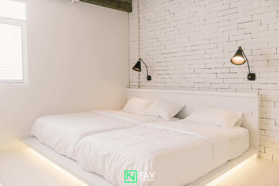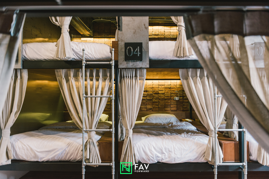 ในส่วนของโฮสเทลก็ตกแต่งได้น่านอนไม่แพ้บรรยากาศน่านั่งของคาเฟ่ โดยคุณบียังคงคอนเซ็ปต์ Thai – Industrial Loft ด้วยการผสมผสานสองสไตล์ให้เป็นหนึ่ง ทั้งการคงความดิบเท่ของสไตล์ลอฟท์ผ่านปูนเปลือยและผนังอิฐมอญโชว์แนว ไม่ลืมเติมความเป็นไทยผ่านบานประตู หน้าต่าง และเฟอร์นิเจอร์ไม้ ขณะเดียวกันก็สร้างบรรยากาศผ่อนคลายน่านอนด้วยการใช้โทนสีขาวเข้าช่วย