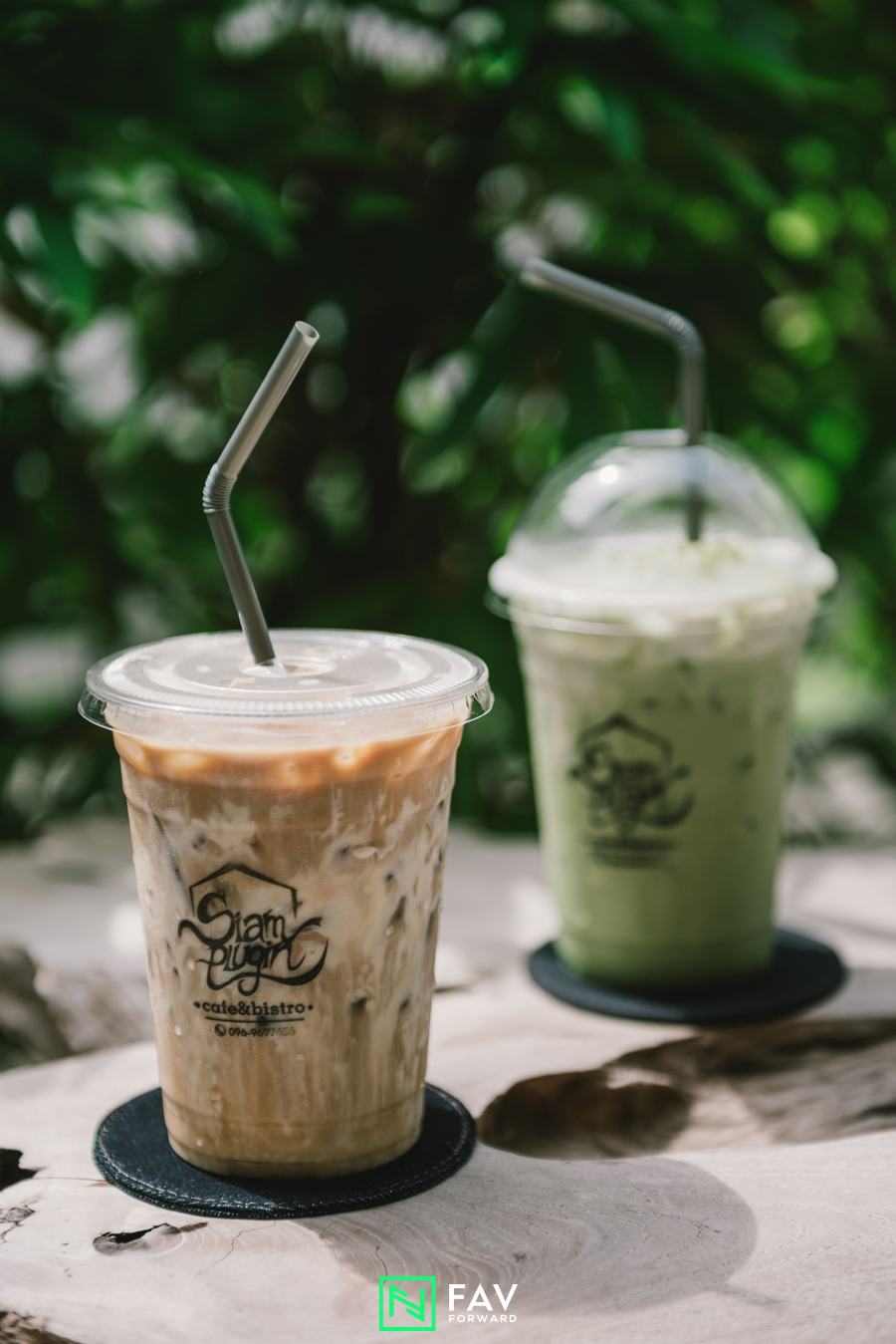 ส่วนเมนูเครื่องดื่มของที่นี่ก็มีดีไม่แพ้ที่ไหน โดยเราขอแนะนำให้ลิ้มลอง “Siam Espresso” (70 บาท) เอสเพรสโซ่เย็นที่เข้มด้วยรสกาแฟ ขณะเดียวกันก็นุ่มกลมกล่อมด้วยนม กลายเป็นเครื่องดื่มรสเข้มที่ให้สัมผัสละมุนจนอยากแนะนำคอกาแฟให้ลิ้มลอง อีกหนึ่งเมนูที่ไม่ควรพลาดคือ “Matcha Latte” (90 บาท) ที่ให้รสชาเขียวแบบเข้มข้น ขณะเดียวกันก็ให้รสหวานกำลังดี เป็นชาเขียวลาเต้ที่กลายเป็นเครื่องดื่มแก้วโปรดของเราได้ไม่ยาก