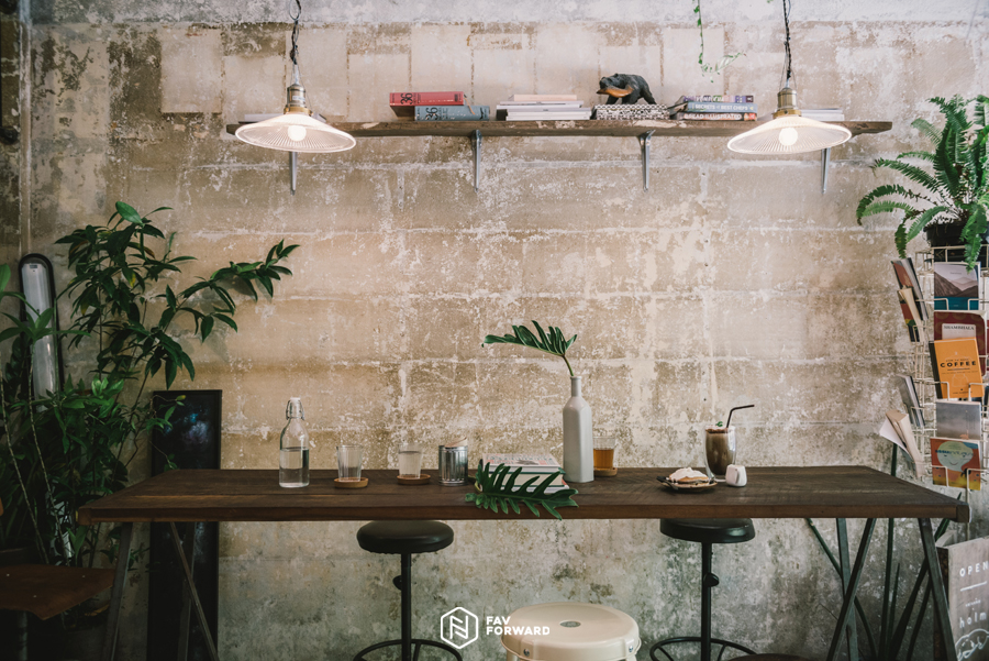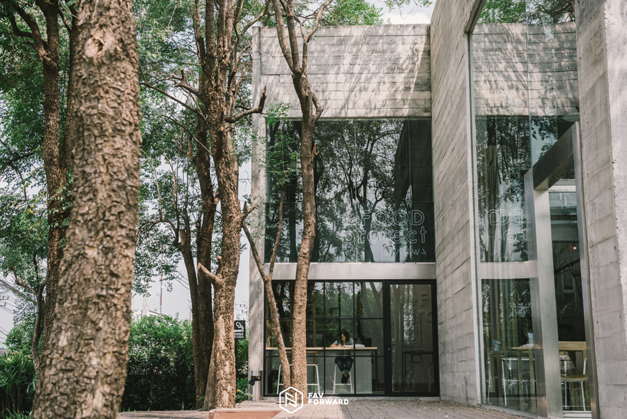 คาเฟ่ที่มีจุดเริ่มต้นมาจากแบรนด์ดีไซน์ ที่นี่จึงไม่ใช่คาเฟ่เท่านั้น แต่ยังเป็น Concept Store สไตล์อินดัสเทียลเท่ๆ กับอาคารคอนกรีตทรงกล่องที่โดดเด่นด้วยงานโครงสร้างโชว์พื้นผิว ตัดความดิบของคอนกรีตด้วยสีเขียวของต้นไม้ใหญ่ที่รายล้อม พร้อมเชื่อมโยงธรรมชาติจากภายนอกเข้าสู่ภายในด้วยผนังกระจกขนาดใหญ่ที่ทำให้คาเฟ่แห่งนี้ดูโปร่งไม่ทึบตัน ขณะที่ภายในร้านกลับตกแต่งให้เรียบง่ายในบรรยากาศโฮมมี่