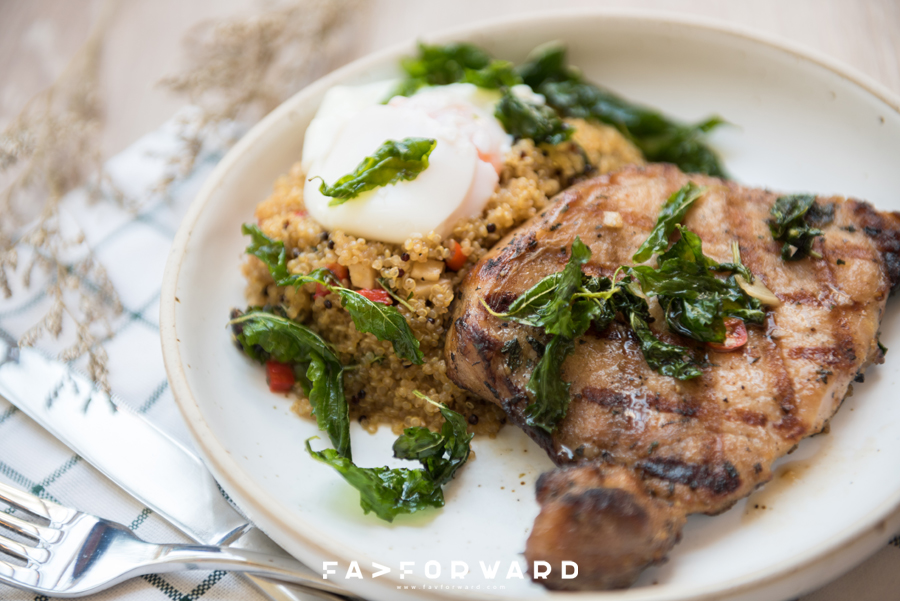 เริ่มจากเมนู Fried Quinoa Holy Basil with Pork Shoulder Steak (280 บาท) หรือคีนัวผัดกะเพรา รสชาติคล้ายผัดกะเพราที่เราทานกัน เพียงแต่ใช้คีนัวแทนข้าว เสิร์ฟพร้อมสเต็กหมูที่นำไปย่างจนหอมนุ่ม ตามมาด้วย Skinny Royale (260 บาท) ประกอบด้วยขนมปังโฮลวีท แซลมอนดิบ และไข่ ราดด้วยซอสโยเกิร์ตฮันนี่มัสตาร์ดสูตรเฉพาะของร้าน ส่วนขนมหวานจาน