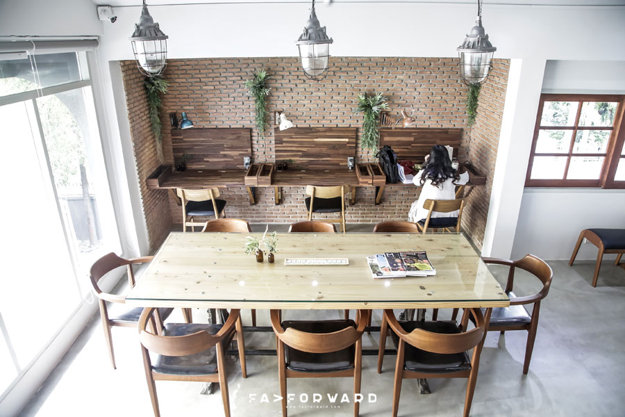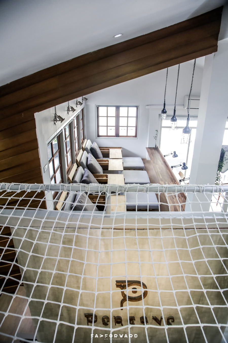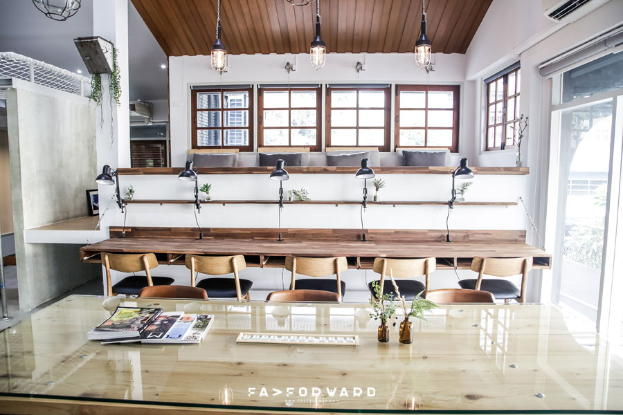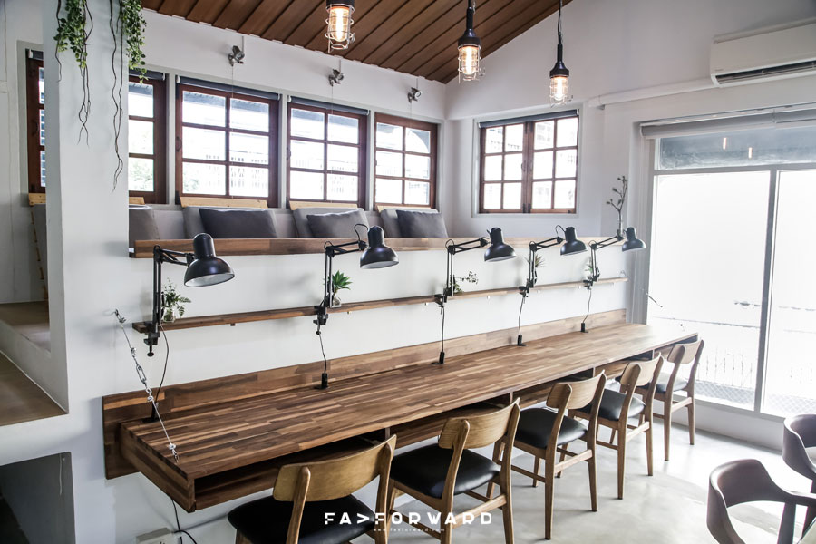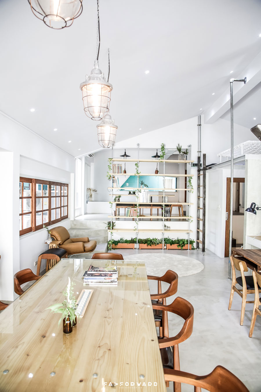 นอกจากนี้ทุกรายละเอียดของ co-working ยังมีเรื่องราวแฝงไว้อีกด้วย “ของแต่ละชิ้นจะมีเรื่องเล่าของมัน ผมจะเลือกอะไรที่เก๋ๆ แปลกๆ หน่อย อย่างนาฬิกากับโคมไฟก็เป็นของที่อยู่บนเรือ โดยเฉพาะนาฬิกา ปกติมันจะต่อเข้ากับตัวคอนโทรลที่จะทำให้นาฬิกาทุกเรือนบนเรือเดินพร้อมกัน แต่ผมก็เอาไปเปลี่ยนเป็นใช้ถ่าน หรือโคมไฟบนโต๊ะก็เป็นโคมไฟที่เคยอยู่ในร้านตัดผม”