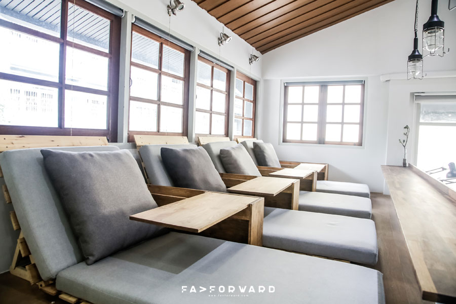 อย่างตรงเก้าอี้ชายหาดตรงนั้น ผมออกแบบตามลักษณะการทำงานของผมเอง เพราะผมชอบคิดงานได้ตอนจะหลับ แล้วปัญหาคือ พอผมคิดได้ก็ต้องลุกขึ้นมา และต้องหากระดาษ หาโต๊ะให้วุ่นวาย พื้นที่ตรงนี้เลยออกแบบให้เป็นเก้าอี้นอนที่มีโต๊ะพับไว้ข้างๆ ซึ่งสามารถลุกขึ้นมาเขียนงานได้เลย
