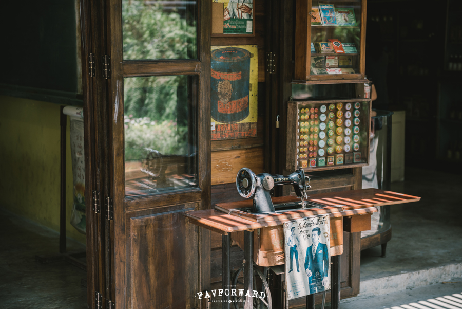 เริ่มจากการซื้อหาไม้เก่าจำนวนมากจากหลายส่วนภูมิภาคเพื่อมาสร้างอาคารพาณิชย์ที่มีหน้าตาไม่ต่างจากตึกแถวจากยุค 90 ซึ่งเป็นสถาปัตยกรรมหลักที่ทำให้บ้านบางเขนมีกลิ่นอายจากอดีตเอาไว้อย่างเข้มข้น ถัดมาคือข้าวของเครื่องใช้จากอดีตที่ถูกจัดวางในอาคารพาณิชย์ที่ถูกจำลองให้เป็นร้านค้าที่สำคัญกับการดำเนินชีวิตของคนไทยสมัยนั้น ซึ่งเรารู้ว่าของเก่ามากมายที่จัดวางไว้ในโซนพิพิธภัณฑ์นั้น ล้วนเป็นของเก่าแท้ๆ ที่คุณกล้วยเก็บสะสมมานาน จึงไม่แปลกหากจุดเริ่มต้นของบ้านบางเขนจะมาจากของเก่าสะสมเหล่านี้