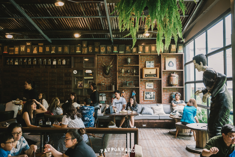 นอกจากบรรยากาศที่เข้มข้นด้วยเสน่ห์ของยุค 90 ที่ชวนให้ใครหลายคนคิดถึงวัยเด็กผ่านสถาปัตยกรรมและข้าวของเครื่องใช้แล้ว ที่นี่ยังรู้ใจคนรุ่นใหม่กับการเปิด ‘คาเฟ่’ สไตล์ลอฟท์สุดเท่ที่ยังคงไม่ทิ้งคอนเซ็ปต์ด้วยของตกแต่งเท่ๆ จากยุค 90 โดยเฉพาะมอเตอร์ไซค์วินเทจที่จัดวางโชว์เสมือนของตกแต่งผนัง และเมื่อขึ้นชื่อว่าคาเฟ่ย่อมมีเครื่องดื่มและเมนูขนมหวานหลายเมนูให้เราได้เลือกชิม ที่สำคัญคาเฟ่แห่งนี้ยังเปิดให้บริการ 24 ชั่วโมงแบบไม่มีวันหยุดอีกด้วย ดังนั้นไม่ว่าเราจะหิวยามดึก หรือจำต้องหาสถานที่ทำงานโต้รุ่งก็ได้ทั้งนั้น