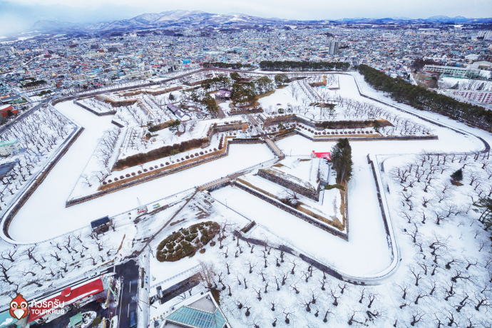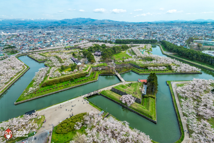 ไฮไลท์ของฮาโกดาเตะที่ต้องไปเยือนคือ “ป้อมโกเรียวกาคุ” (Fort Goryokaku) เมื่อมองมุมสูงจะเห็นป้อมนี้เป็นรูปดาว 5 แฉก ซึ่งเป็นที่มาของชื่อว่า “ป้อมดาว 5 แฉก” แน่นอว่าเมื่อเป็นป้อม วัตถุประสงค์แรกของการสร้างคงหนีไม่พ้นพื้นที่สู้รบ ป้อมโกเรียวกาคุสร้างขึ้นในสมัยตระกูลโชกุนตระโทกุงาวะ พ.ศ.2400 ซึ่งปีสุดท้ายของสมัยเอโดะ หรือกว่า 150 ปีมาแล้ว โดยในสมัยนั้นป้อมโกเรียวกาคุทำหน้าที่เป็นปราการปกป้องเมืองฮาโกดาเตะจากการถูกคุกคามของมหาอำนาจตะวันตกครั้งสมัยที่อเมริกาต้องการกดดันให้ประเทศญี่ปุ่นเปิดประเทศ ทำให้สถาปัตยกรรมของป้องได้รับอิทธิพลจากชาวตะวันตก