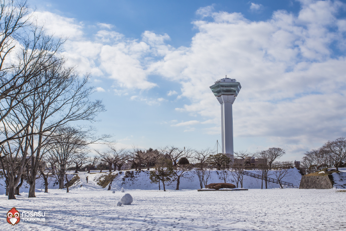 ถัดเข้าไปด้านหลังของอาคารสำนักงานคือ ‘หอคอยโกเรียวกาคุ’ (Goryokaku Tower) หอคอยรูปทรง 5 เหลี่ยม สูง 107 เมตร เป็นจุดชมวิวเมืองฮาโกดาเตะที่ทำให้เราสามารถชมป้อมปราการรูปดาว 5 แฉกได้อย่างเต็มตาและชัดเจนกับทัศนียภาพแบบพาโนราม่า