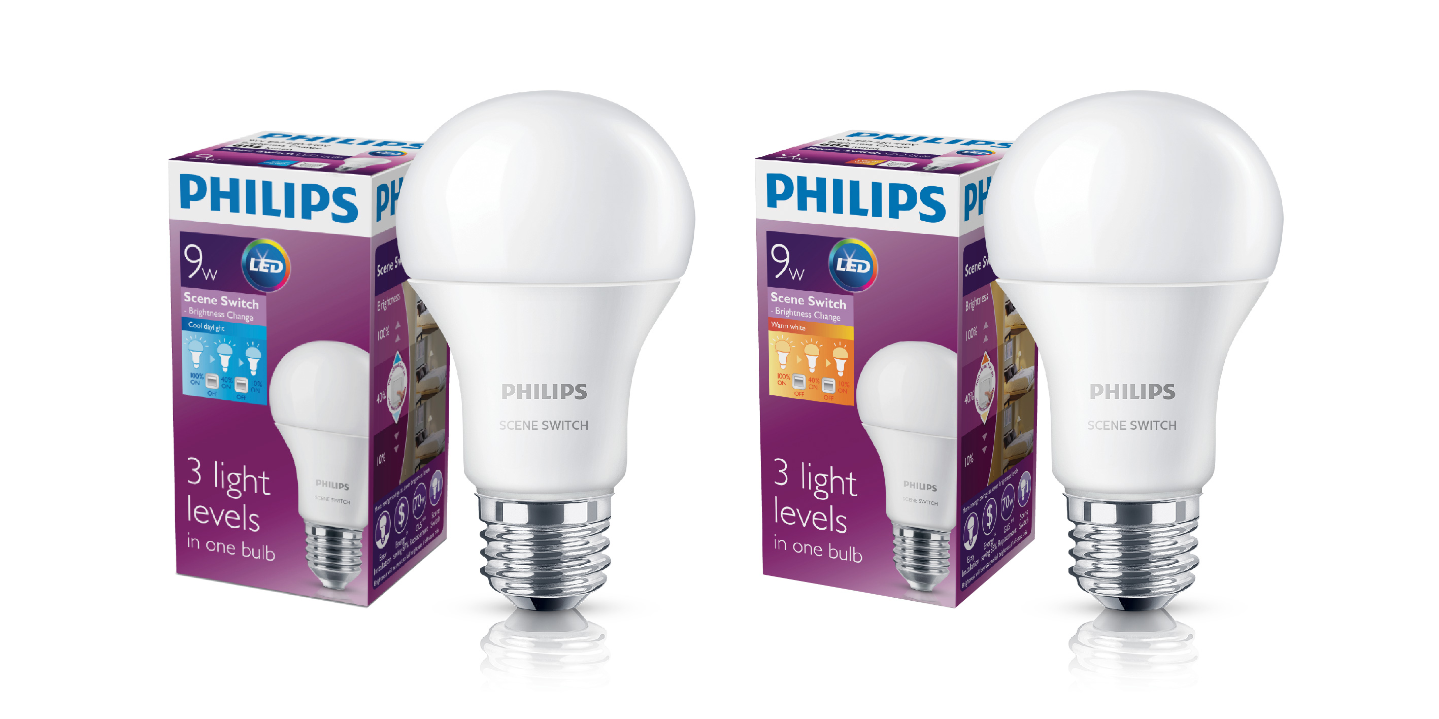 นอกจากนี้แล้วทางฟิลลิปส์ยังได้เปิดตัว หลอดไฟ Philips LED SceneSwitch – Brightness Change หลอดไฟแอลอีดีรุ่นใหม่ ที่มาพร้อมกับคุณสมบัติที่สามารถปรับความสว่างของแสงได้สามระดับในหลอดเดียว โดยสามารถใช้สวิตซ์ไฟตัวเดิมโดยไม่ต้องมีอุปกรณ์ใดๆเพิ่มเติม ซึ่งมีโทนสีให้เลือก 2 แบบได้แก่คูลเดย์ไลท์หรือแสงขาว (6500k) และโทนแสงวอร์มไวท์หรือแสงเหลืองนวล (3000K) มาในหลอดขนาด 9 วัตต์ ช่วยประหยัดพลังงานได้สูงสุดร้อยละ 87 พร้อมอายุการใช้งานที่ยาวนานถึง 15 ปี โดยตอบโจทย์ทุกความต้องการที่หลากหลายของผู้บริโภค ช่วยสร้างบรรยากาศและปรับอารมณ์ให้เหมาะสมสำหรับกิจกรรมต่าง ๆ ภายในบ้าน ไม่ว่าจะเป็นการแต่งหน้า การทำอาหาร หรือการพักผ่อน เป็นต้น