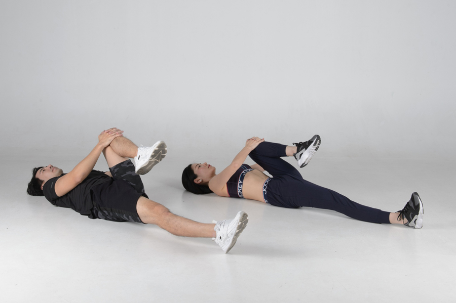 - ท่าที่ 3 นอนราบไปกับพื้น แล้วยกเข่าขึ้นมาที่หน้าอก แล้วนำมือทั้ง 2 ข้างผสานกันไว้ที่หัวเข่าแล้วดึงเข้าหาตัว ขาซ้ายและหลังต้องอยู่ราบกับพื้น ดึงค้างไว้ 10-15 วินาที เสร็จแล้วทำซ้ำอีกข้างหนึ่ง