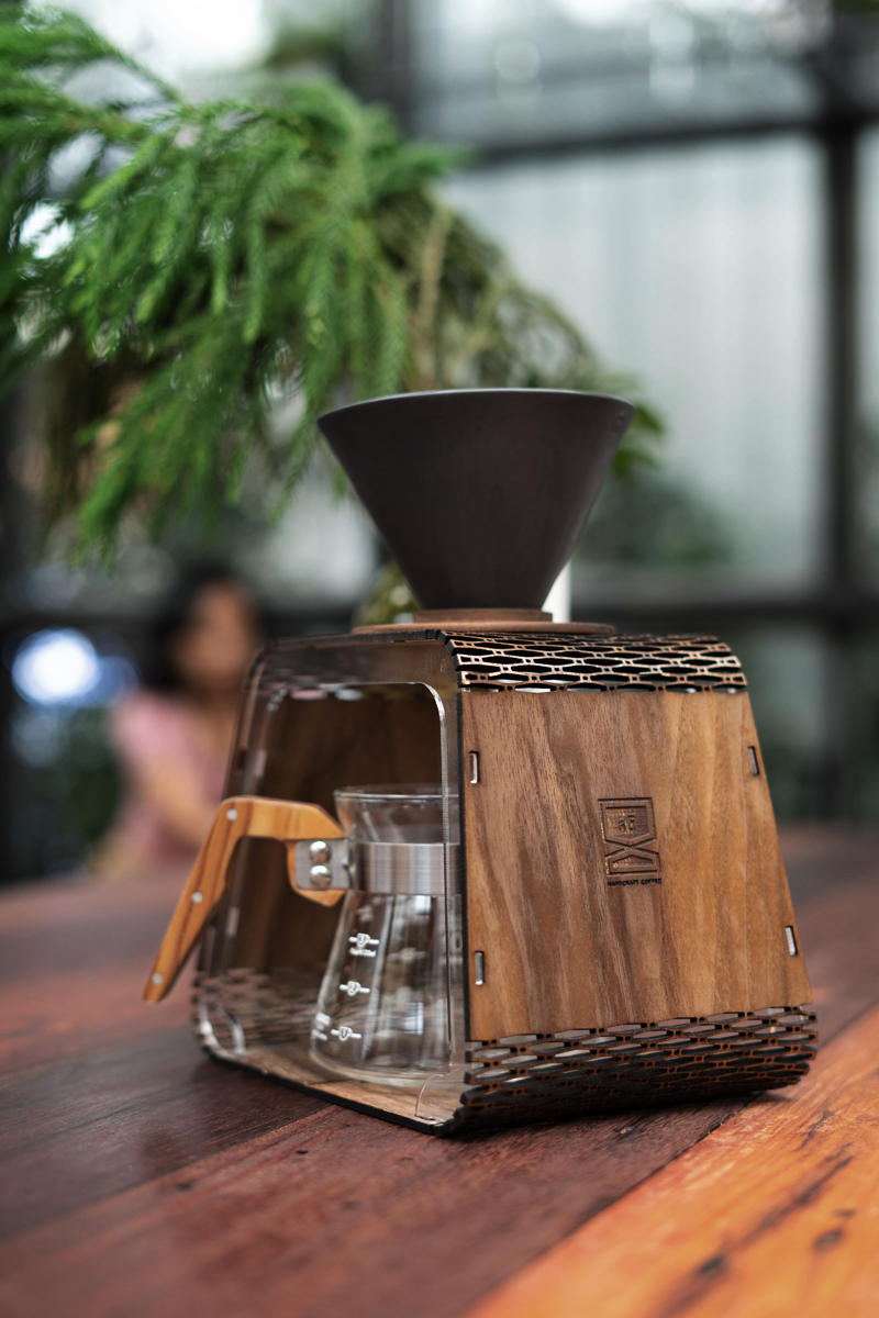 “จุดเริ่มต้นของการดีไซน์ ‘น้อม’ คือการที่ผมอยากจะออกแบบแท่นรองกาแฟสำหรับร้านกาแฟสติ แฮนด์ คราฟ์ คอฟฟี่ ซึ่งอยู่ด้านหลังของเวิร์คกิ้งสเปซ MADE HERE ON EARTH(MHOE) หรือ โม โดยออกแบบแท่นรองสำหรับชงกาแฟให้มีความเฉพาะตัวโดยใช้ไม้เป็นองค์ประกอบหลักเป็นไอเดียน่าสนใจ นั่นจึงเป็นที่มาของการดีไซน์ผลงาน ‘น้อม’ ออกมา โดยผมได้เน้นถึงรูปทรง และความโปร่งเพื่อความเหมาะสมกับการใช้งาน โดยให้มีพื้นที่ว่างพอที่จะสอดภาชนะรองรับหยดกาแฟ ทั้งยังมีระดับความสูงได้อย่างพอเหมาะกับการดริปกาแฟในแต่ละครั้ง โดยไม่ลืมที่จะใส่ความเป็นไทยร่วมสมัยผ่านลวดลายของเนื้อไม้เพื่อให้เกิดความเป็นเอกลักษณ์ของผลงาน ‘น้อม’ นอกจากนี้ผมยังมองว่าผลงาน ‘น้อม’ ที่ออกแบบด้วยไม้ยังสามารถแสดงให้เห็นถึงวัตถุประสงค์ของการใช้ประโยชน์จากไม้ที่สามารถนำมาใช้ทดแทนวัสดุอื่นๆ ที่ไม่ทำลายสิ่งแวดล้อมอีกด้วย”