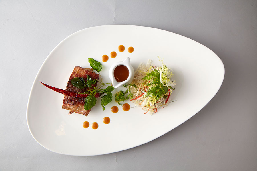 Highlights: ปลาชั้นเยี่ยมที่หายาก แต่ได้รสสัมผัสที่นุ่มลิ้นและรสชาติกลมกล่อม คือวัตถุดิบที่ชูให้เมนูนี้พิเศษและไม่เหมือนใคร โดยเชฟวรินธรตั้งใจนำวัตถุดิบจากโครงการหลวงอย่างเนื้อปลาสเตอร์เจียนมารมควันอย่างพิถีพิถัน เพื่อให้ได้เนื้อปลาที่ให้กลิ่นไหม้เบาบางกำลังพอดีจากด้านนอก และนุ่มละมุนจากด้านใน เสิรฟพร้อมยำส้มโอเลิศรสที่ให้รสชาติความเปรี้ยวจางๆ จากส้มโอ ผสมกันอย่างลงตัวกับเครื่องยำและความเผ็ดร้อนจากสมุนไพรไทย นำมาตัดกับรสชาติความมันและกลมกล่อมของเนื้อปลาสเตอร์เจียนได้อย่างสมบูรณ์แบบ