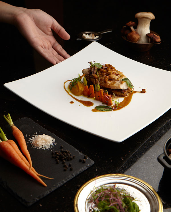 Highlights: เชฟอลันเลือกอกไก่ สายพันธุ์เบรสจากประเทศฝรั่งเศสมาเป็นวัตถุดิบหลักของเมนูนี้ ด้วยไก่เบรสได้รับขนานนามว่าเป็นไก่ที่มีรสชาติดีที่สุดในโลก ตั้งแต่ปีค.ศ.1600 ด้วยเนื้อไก่สีชมพูอ่อนและติดมันแทรกสีเหลืองทอง รวมถึงผิวหนังที่ฉ่ำไปด้วยน้ำ ให้รสสัมผัสที่หวานนุ่มละมุนลิ้น