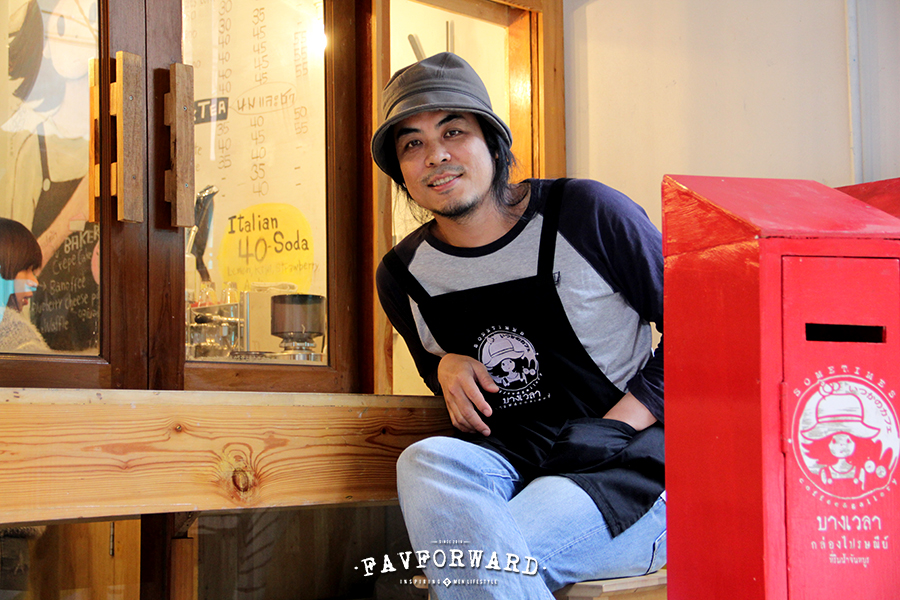 แล้วตอนนั้นก็คิดว่า ถ้าจะเปิดร้านกาแฟ ก็อยากจะเปิดแถวบ้านเก่าที่เคยอยู่ตอนเด็กๆ ก็คือ ชุมชนเก่าย่านริมน้ำ พอดีกับจังหวะเราผ่านไปแถวนั้น แล้วเค้าติดประกาศให้เช่าพอดี ก็ลองถามเค้าดู ตอนแรกจะมีตู้กดน้ำปาเข้าไปเกือบครึ่งหน้าร้านแล้ว เราก็ลังเลอยู่ ทำก็ได้ ไม่ทำก็ได้ เหมือนไม่ได้จริงจังเลยโน๊ะ (หัวเราะ) เราก็โยนให้เป็นภาระของเจ้าของบ้านว่า ถ้าเอาตู้กดน้ำออก เราจะเช่า ตอนนั้นเราก็คิดว่า เค้าคงไม่เอาออกหรอก ปรากฏว่าเค้าเอาออกให้ แล้วเราก็รับปากเค้าไว้แล้วว่าจะเช่า ก็เอาวะ เช่าก็เช่า…ก็ได้วะ (หัวเราะ) พอเช่าแล้วก็ต้องทำ ทำก็ทำ (หัวเราะ)