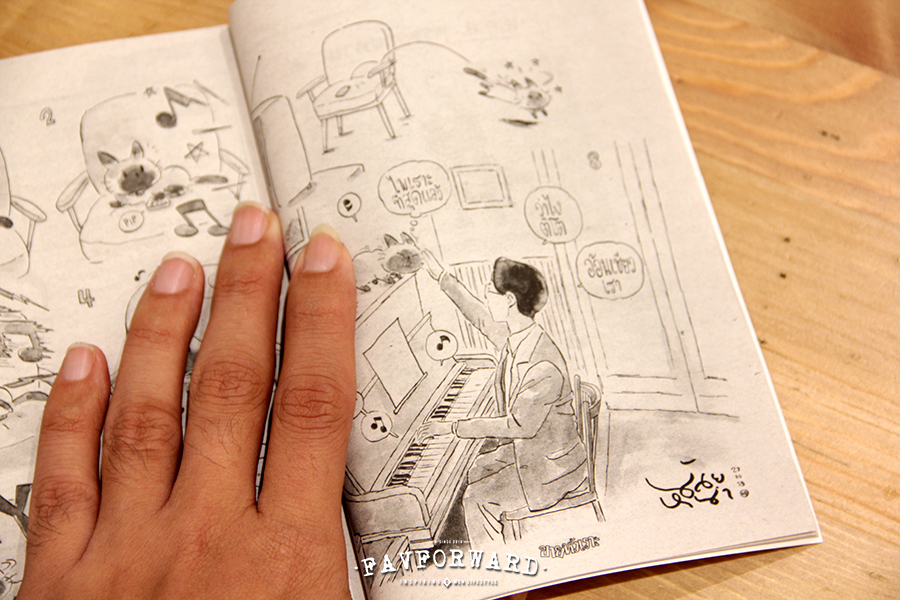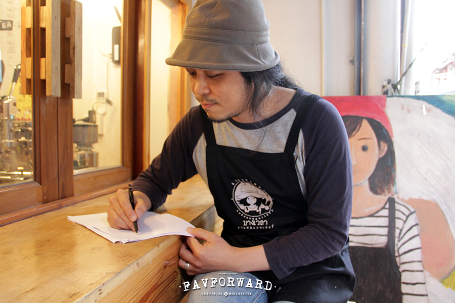 แต่ด้วยเครื่องชงที่ซื้อมาเนี่ย มันเป็นเครื่องชงแบบคันโยก รองรับสูงสุดก็ได้แค่ สามสิบ สี่สิบแก้ว ต่อวัน เพราะไม่ได้คิดว่ามันจะขายดี ด้วยความที่เราไม่มีความรู้เรื่องขายของเลย มีลูกค้ามาก็ชง ไม่มีก็นั่งวาดการ์ตูน แต่พอเอาเข้าจริง มันไม่ใช่ ต่อให้ลูกค้ากินเสร็จแล้ว เราก็ต้องเก็บโต๊ะ เก็บล้าง คิดเงิน เสิร์ฟ มันมีรายละเอียดเยอะแยะเลย ไม่ได้มีเวลาว่างมานั่งวาดหรอก ชีวิตมันไม่เหมือนในละคร ที่ชีวิตดูชิลเนอะ ช่วงเปิดร้านแรกๆ แทบไม่ได้เขียนเลย สามสี่เดือนไม่ได้ส่งงานเลย